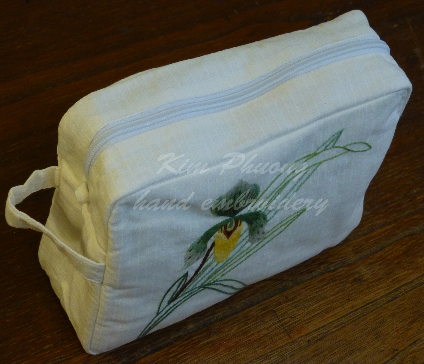 Sản phẩm Túi mỹ phẩm Mẫu LAN HÀI VÀNG Vải cotton Màu vải kem Kích thước chung rộng 16 x dài 23 x cao 7cm Hình dạng chữ nhật, có lót bên trong, dây kéo