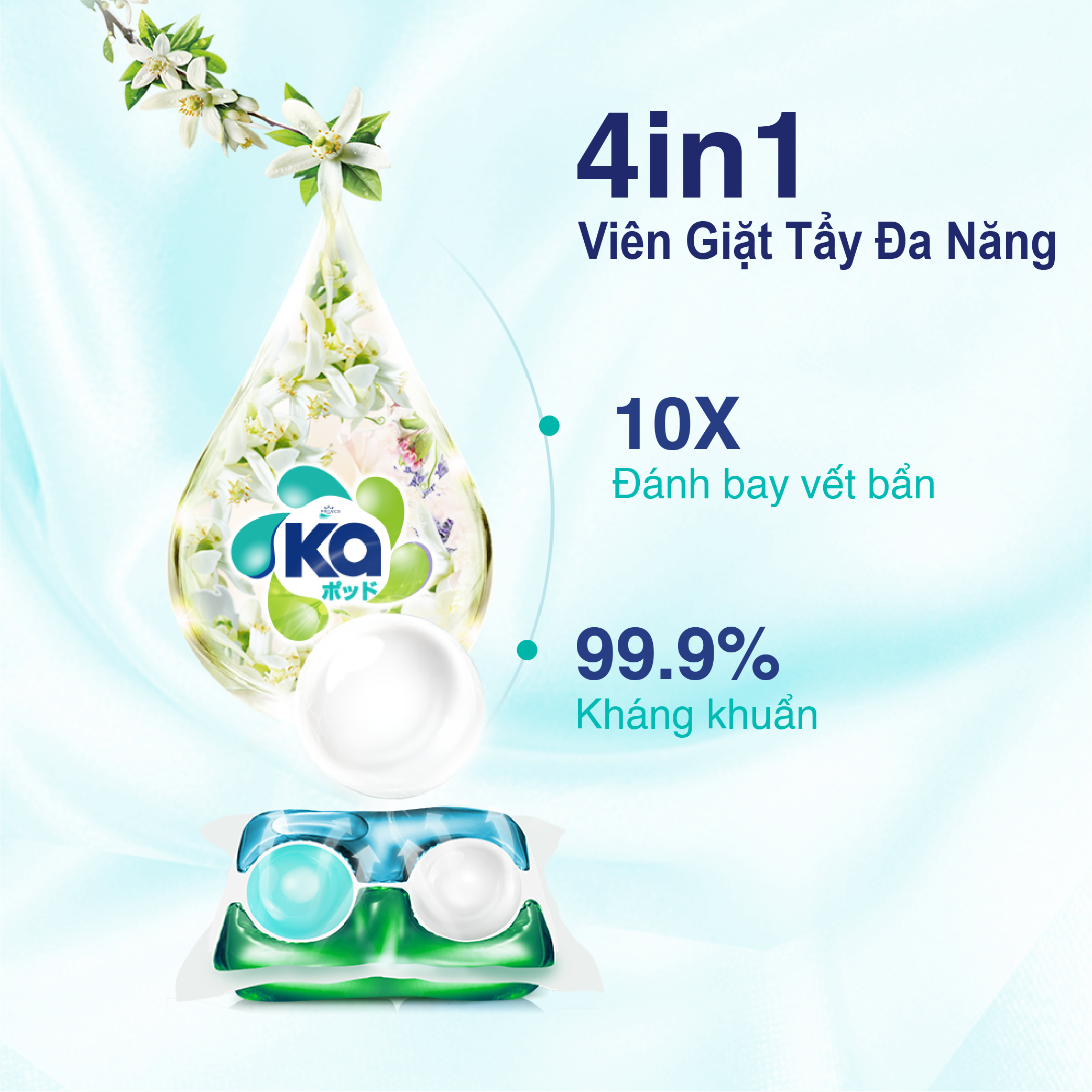 Không còn tình trạng rơi đổ lộn xộn và phải đong đếm bột giặt, việc giặt giũ sẽ tiện lợi hơn với Viên giặt đa năng Ka 4 trong 1. Với công thức siêu đậm