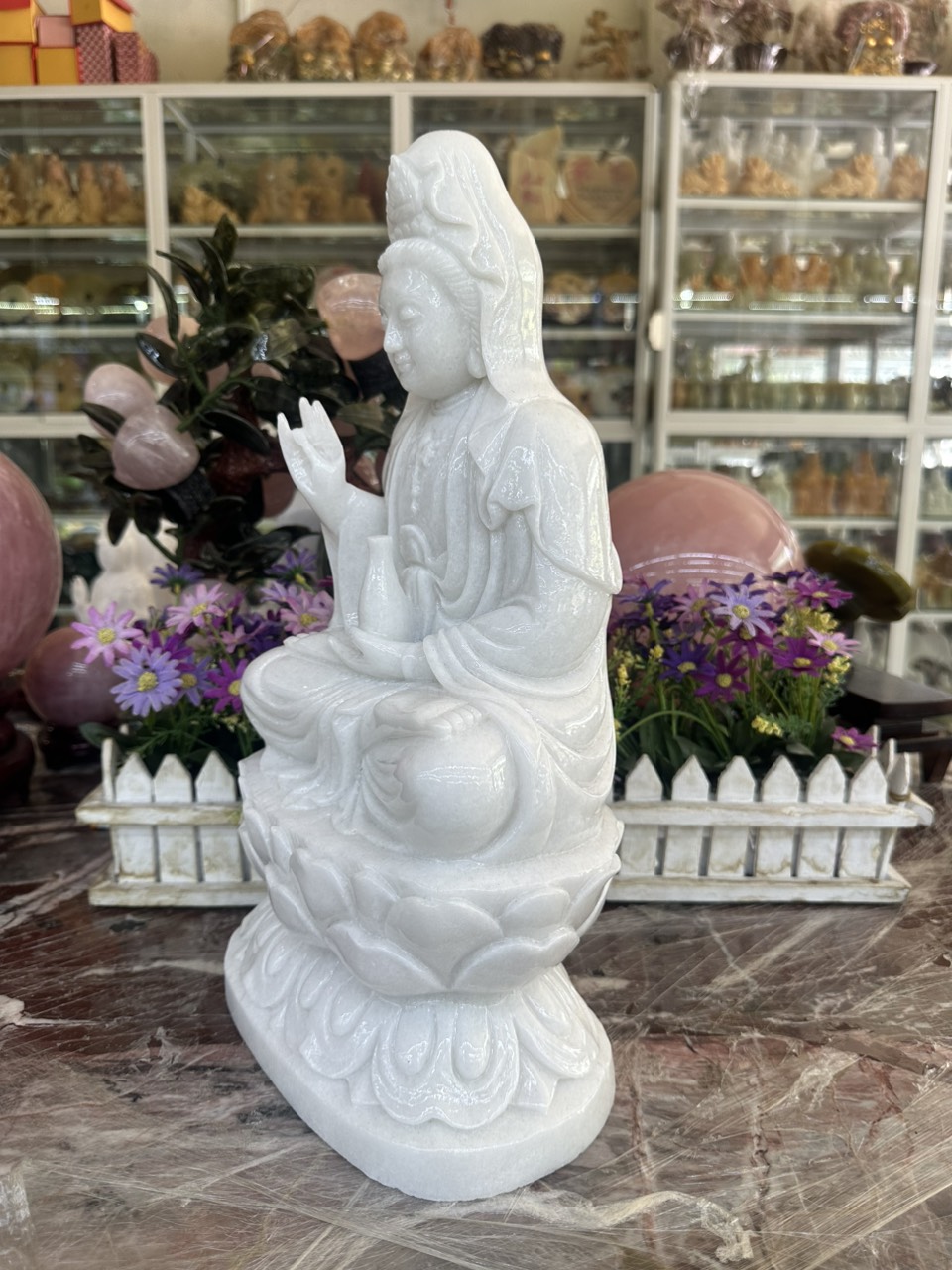✨Tượng Phật Bà Quan Thế Âm Bồ Tát ngồi đài sen đá cẩm thạch trắng - Cao 40 cm