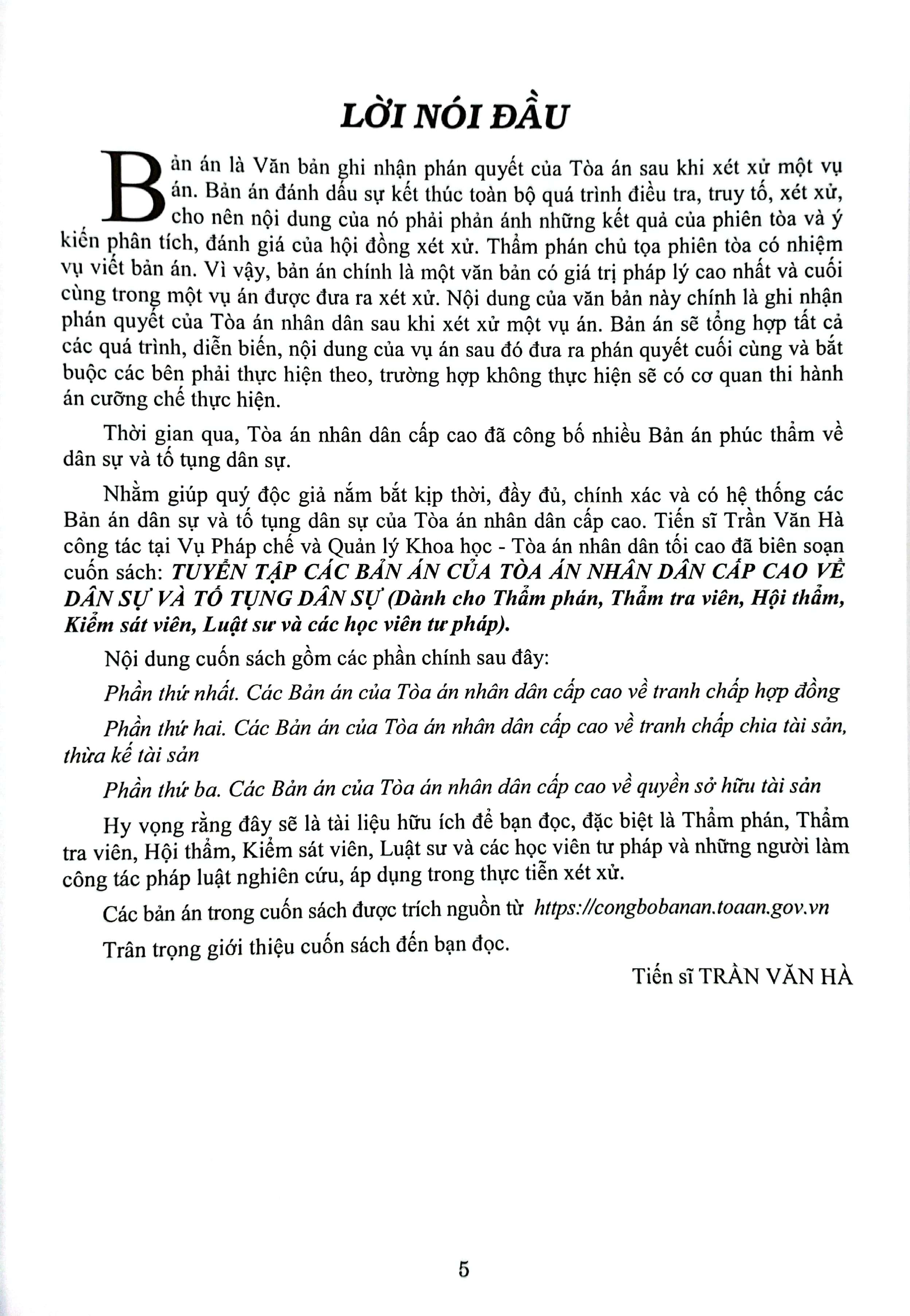 Phần thứ ba. Các Bản án của Tòa án nhân dân cấp cao về quyền sở hữu tài sản Hy vọng rằng đây sẽ là tài liệu hữu ích để bạn đọc, đặc biệt là Thẩm phán, Thẩm tra viên, Hội thẩm, Kiểm sát viên, Luật sư và các học viên tư pháp và những người làm công tác pháp luật nghiên cứu, áp dụng trong thực tiễn xét xử.