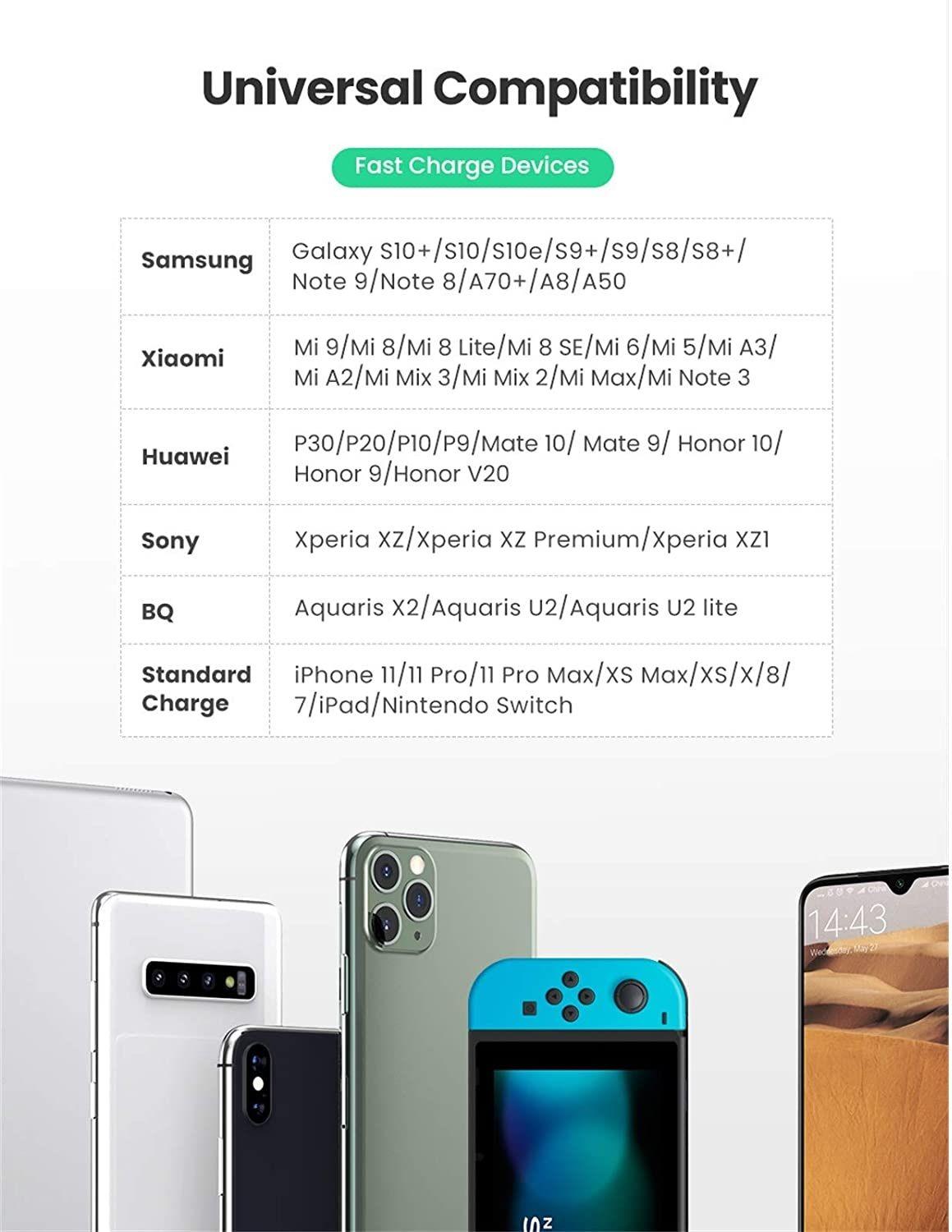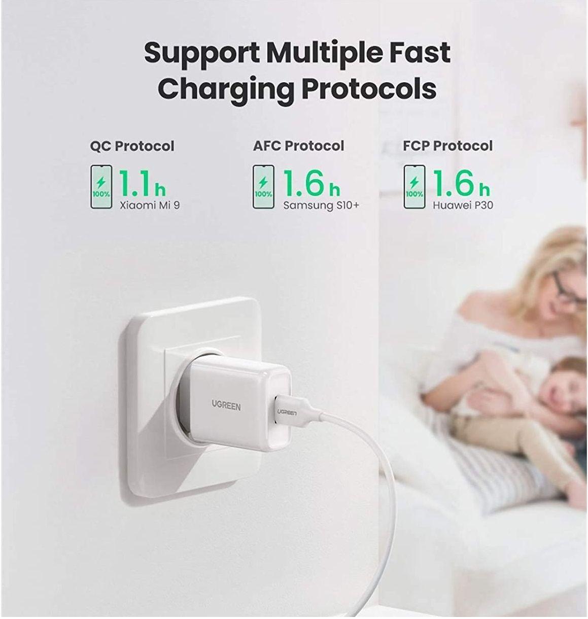 Ugreen 40715 Qc3.0 + Qc3.0 36W Dual Fcp Usb Charger Quick Charge White CD161 1. Input: 100-240V ~ 50 / 60Hz 1.2A 2. Max 2xQuick Charge 3.0 Output: 5V / 3A 9V / 2A 12V