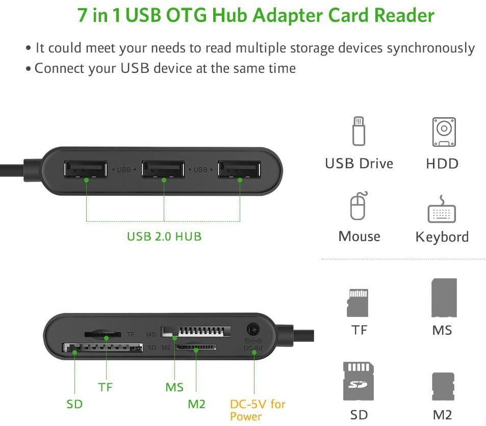 1. Input: USB-A 3.0 2. Output: Compatible SD / TF UHS-I SD, SDHC, SDXC, MICRO SD, MICRO SDHC, MICRO SDXC 3. Supports cards up to 2TB 4. Data transfer rate: 5Gbps 5. Material: Aluminum 6.