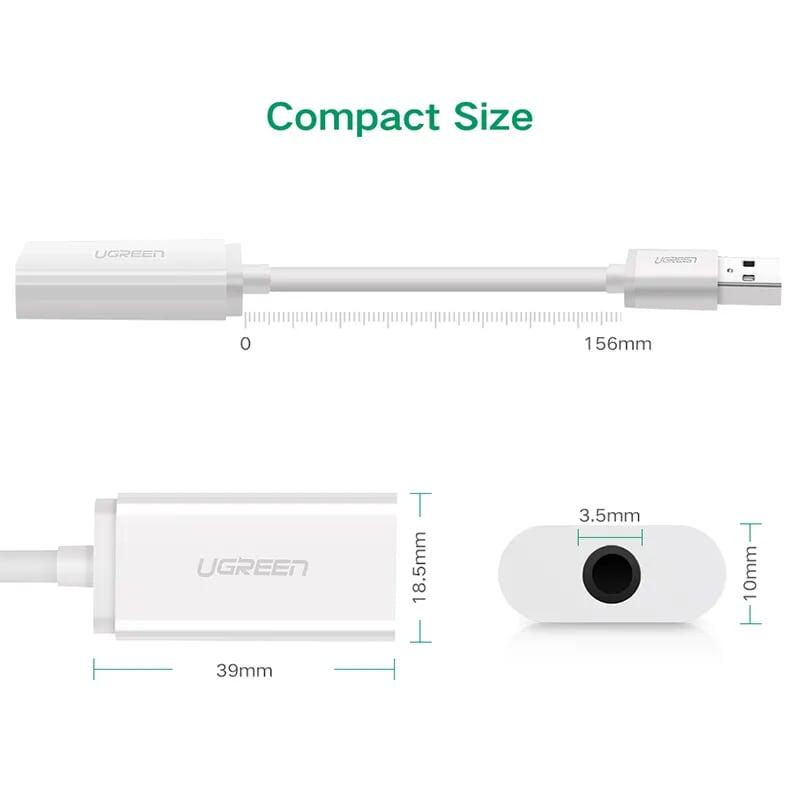 Ugreen 30143 white color usb 2.0 external sound adapter us205 1. Material: PVC+ Tinned Copper 2. Play & plug 3. Nickel plated port 4. OD: 4.0 5. Port: USB2.0 - 3.5mm 6. Color: White 7.
