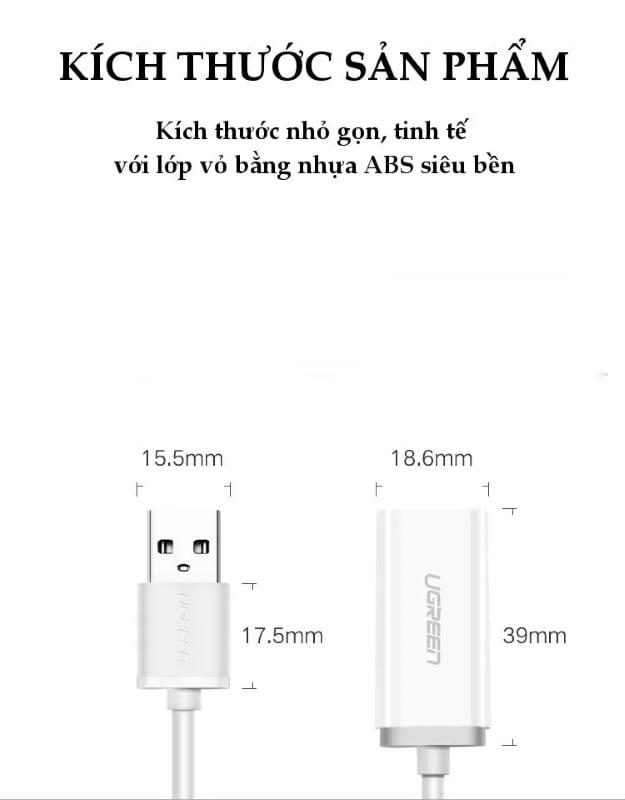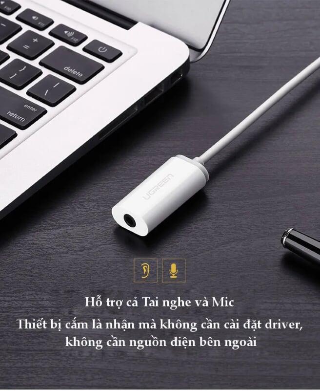 Ugreen 30712 usb external stereo sound adapter us206 1. Specifications Computer Connector: USB 2.0 Male Headset Connector: 3.5mm TRRS Female 2. Cable Length:15cm 3. Chipset: C-Media 4. Hỗ Trợ Mic và Tai Nghe 5. Màu: