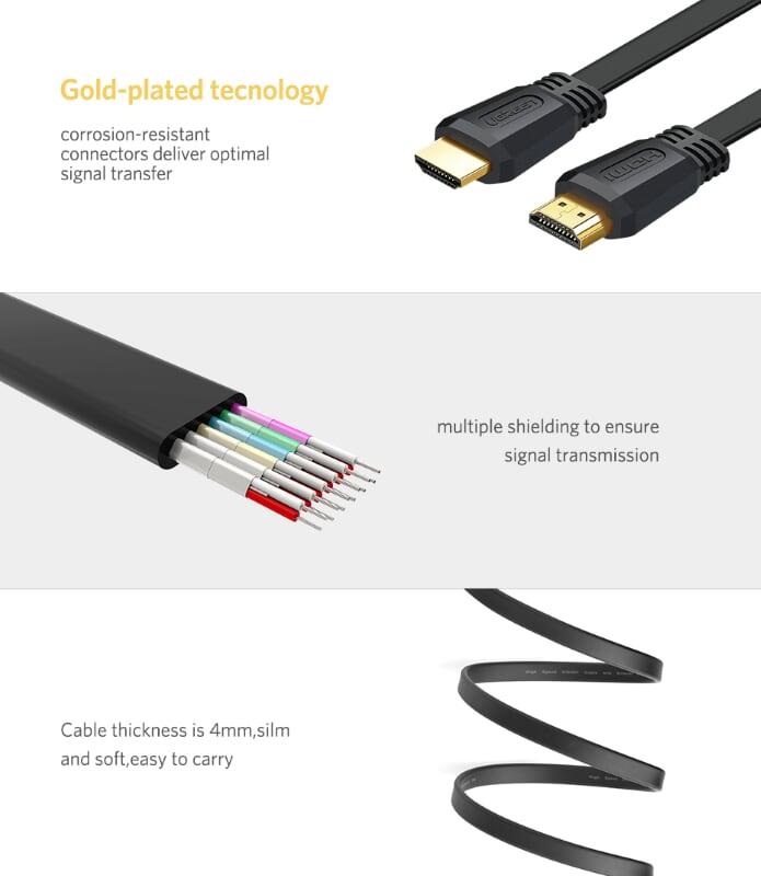 Ugreen 50820 3M Hdmi 2.0 Flat Cable Màu Đen Black Ed015 1. Length: 3m 2. Cable standard: HDMI 2.0 (Backward compatible with HDMI 1.4, 1.3 ) 3. Support resolution: 4K * 2K @ 30Hz (4096x2160P)