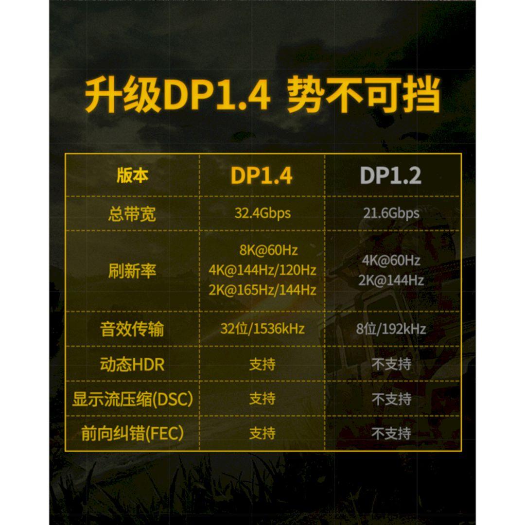1. mini DP to DP 1.4 cable 2. DP protocol: DP 1.4 3. Total Broadband: 32.4Gbps 4. Resolution: 8K 5. Refresh rate: 8K/60Hz, 4K@/144/120Hz, 2K@240/165Hz 6. Shielding: aluminum foil + ground wire + metal braided
