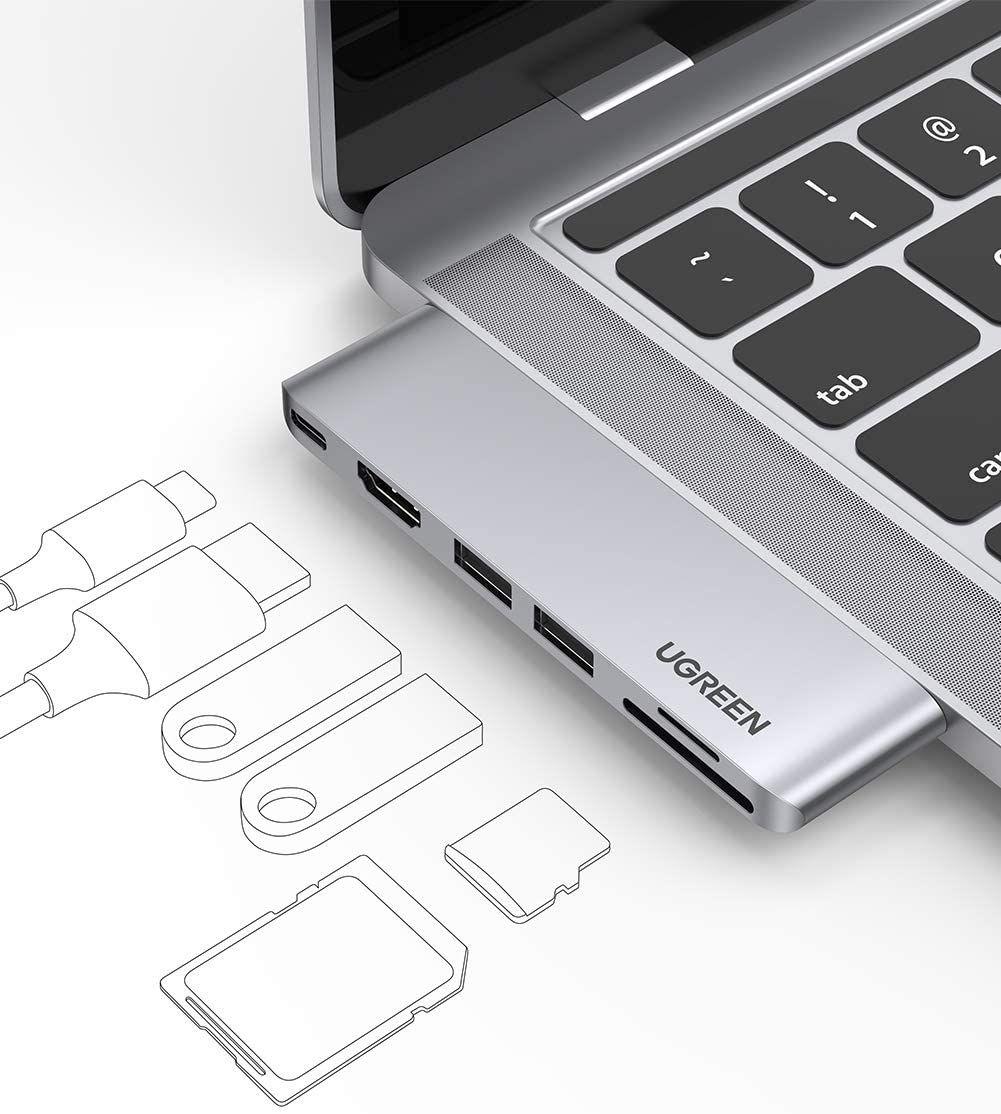 1. Hub đa năng 6 trong 1 Ugreen 80129 giúp bạn mở rộng từ 1 cổng USB Type C sang các cổng khác như HDMI, USB 3.0, khe đọc thẻ nhớ. Giúp bạn kết nối