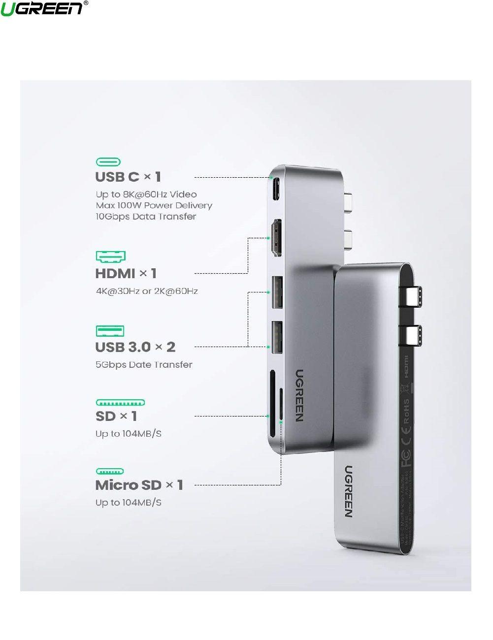 ✨Ugreen UG80856CM380TK 6 trong 2 macbook pro thunderbolt 3 type c hub 8k HDMI - PD - Sd- TF - 2 x Usb A 3.0 màu xám - HÀNG CHÍNH HÃNG