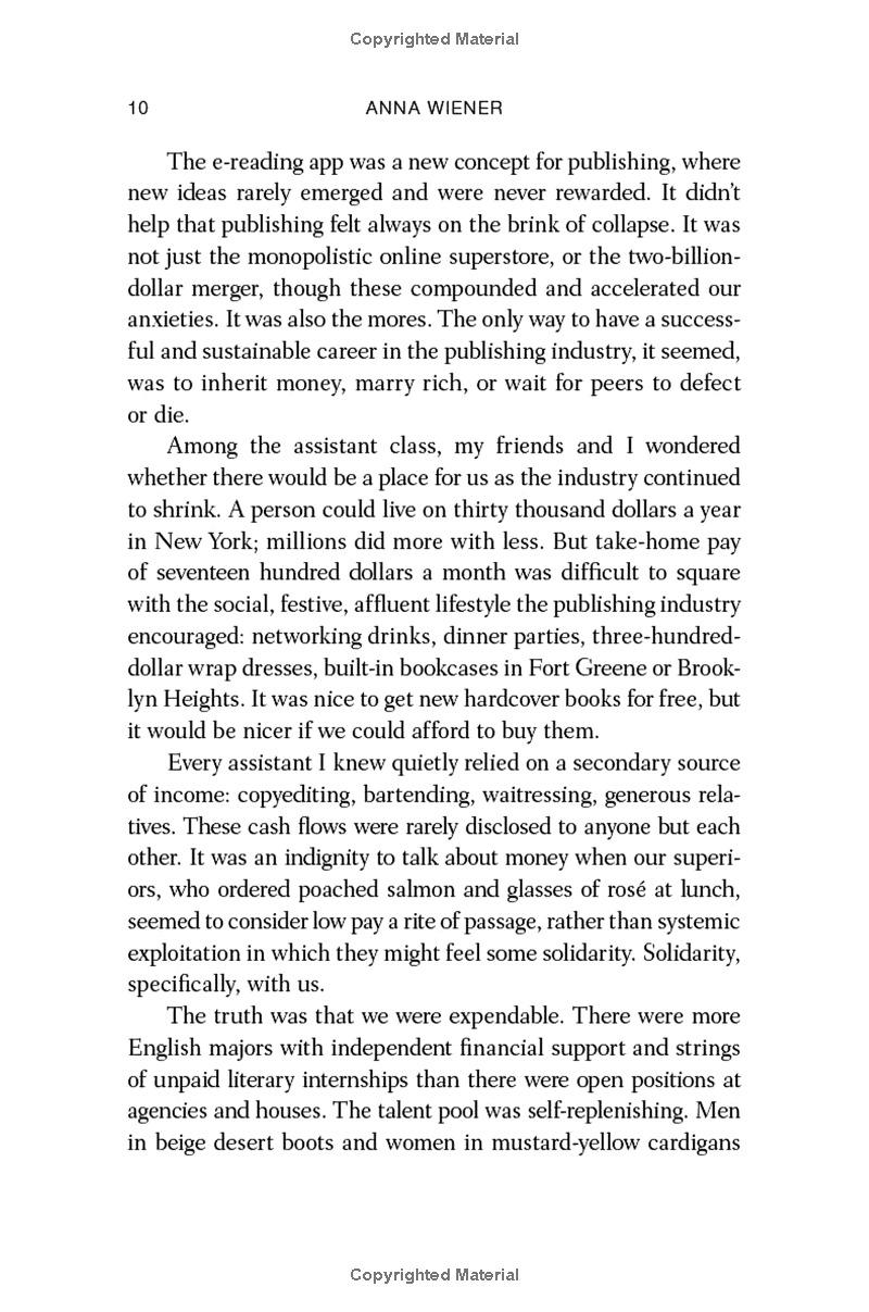 At twenty-five years old, Anna Wiener was beginning to tire of her assistant job in New York publishing. There was no room to grow, and the voyeuristic thrill of answering someone else’s phone had worn thin.