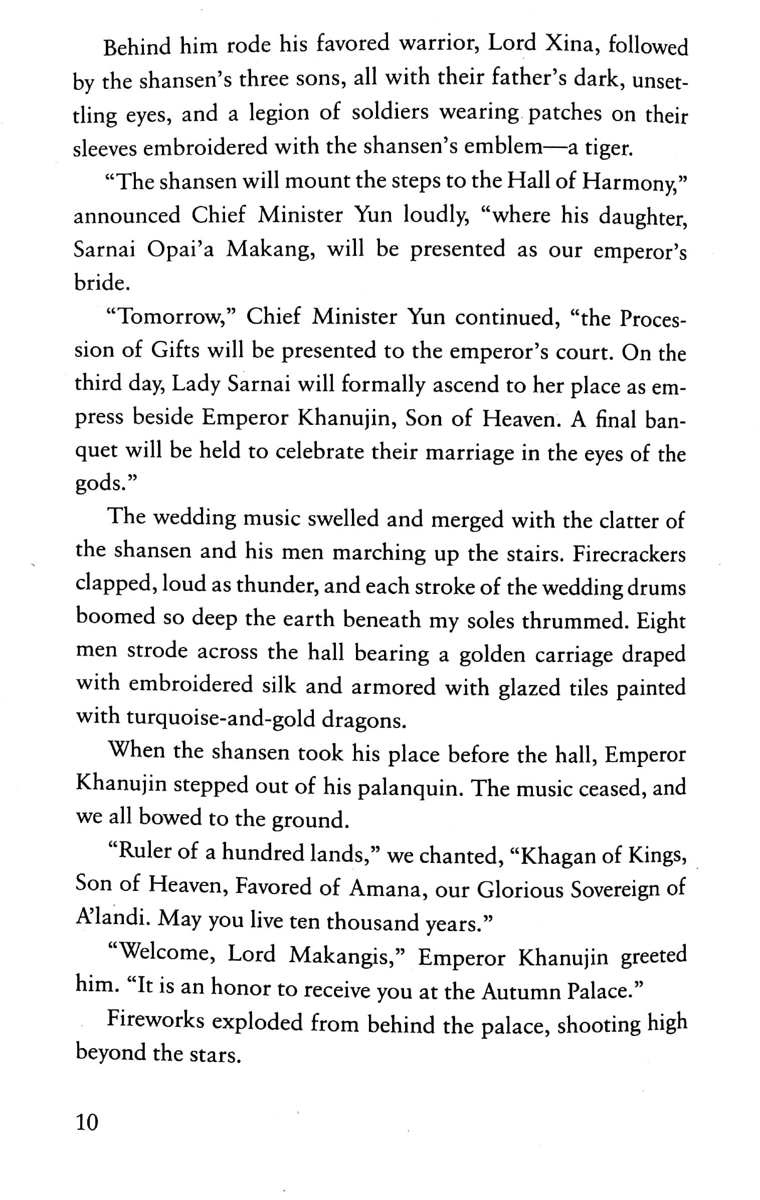 Maia Tamarin's journey to sew the dresses of the sun, the moon, and the stars has taken a grievous toll. She returns to a kingdom on the brink of war. Edan, the boy she loves, is gone--perhaps forever--and no sooner does she set foot in the Autumn Palace than she is forced to don the dress of the sun and assume the place of the emperor's bride-to-be to keep the peace. When the emperor's rivals learn of her deception, there is hell to pay, but the war raging around Maia is nothing compared to the battle within.