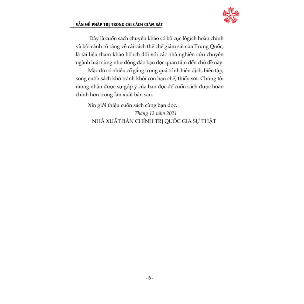 Mua tại TiktokCuốn sách được kết cấu gồm 5 phần, trình bày một cách toàn diện chế độ giám sát cũng như vấn đề xây dựng pháp luật Trung Quốc về giám sát từ hai góc độ lý luận và thực tiễn, đưa ra các giải pháp nhằm góp phần hoàn thiện thể chế giám sát của Trung Quốc. Đây là cuốn sách chuyên khảo có bố cục lôgích hoàn chỉnh và bối cảnh rõ ràng về cải cách thể chế giám sát của Trung Quốc, là tài liệu tham khảo bổ ích đối với các nhà nghiên cứu chuyên ngành luật cũng như đông đảo bạn đọc quan tâm đến chủ đề này.