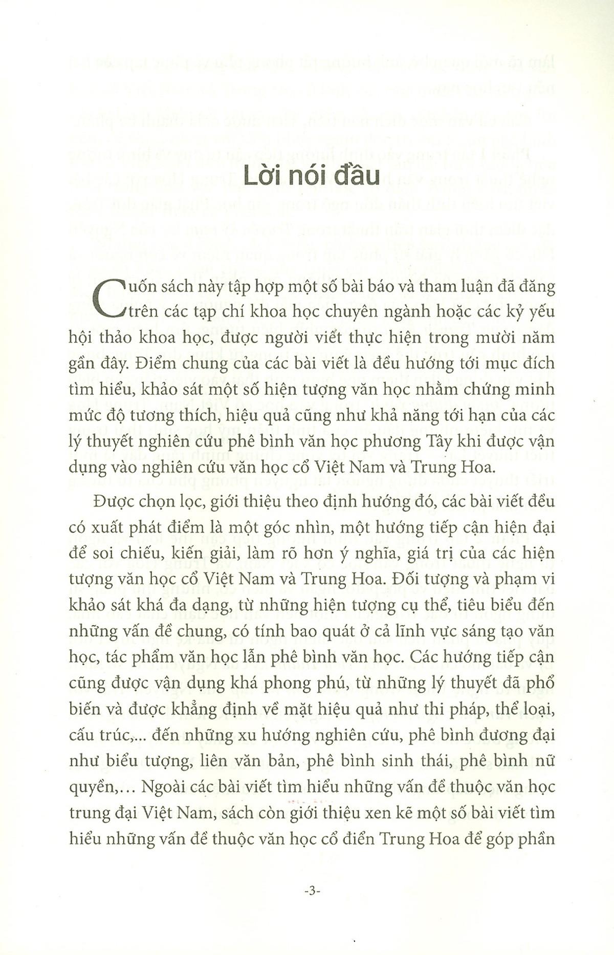 Cuốn sách này tập hợp một số bài báo và tham luận đã đăng trên các tạp chí khoa học chuyên ngành hoặc các kỷ yếu hội thảo khoa học, được người viết thực hiện trong 10 năm gần đây. Điểm chung của các bài viết là đều hướng tới mục đích tìm hiểu, khảo sát một số hiện tượng văn học nhằm chứng minh mức độ tương thích, hiệu quả cũng như khả năng tới hạn của các lý thuyết nghiên cứu phê bình văn học phương Tây khi được vận dụng vào nghiên cứu văn học cổ Việt Nam và Trung Hoa.