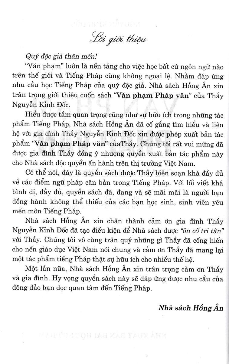 “Văn phạm” luôn là nền tảng cho việc học bất cứ ngôn ngữ nào trên thế giới và Tiếng Pháp cũng không ngoại lệ. Nhằm đáp ứng nhu cầu học Tiếng Pháp của quý độc giả. Nhà sách Hồng Ân xin trân trọng giới thiệu cuốn sách “Văn phạm Pháp văn” của Thầy Nguyễn Kỉnh Đốc. Hiểu được tầm quan trọng cũng như sự hữu ích trong những tác phẩm Tiếng Pháp, Nhà sách Hồng Ân đã cố gắng tìm hiểu và liên hệ với gia đình Thầy Nguyễn Kỉnh Đốc xin được phép xuất bản tác phẩm “Văn phạm Pháp văn” của Thầy. Chúng tôi rất vui mừng đã được gia đình Thầy đồng ý nhượng quyền xuất bản tác phẩm này cho Nhà sách độc quyền ấn hành trên thị trường Việt Nam. Có thể nói, đây là quyển sách được Thầy biên soạn khá đầy đủ về các điểm ngữ pháp căn bản trong Tiếng Pháp. Với lối viết khá bình dị, đầy đủ, quyển sách đã, đang và sẽ mãi mãi là người bạn đồng hành không thể thiếu của các bạn học sinh, sinh viên yêu mến môn Tiếng Pháp.