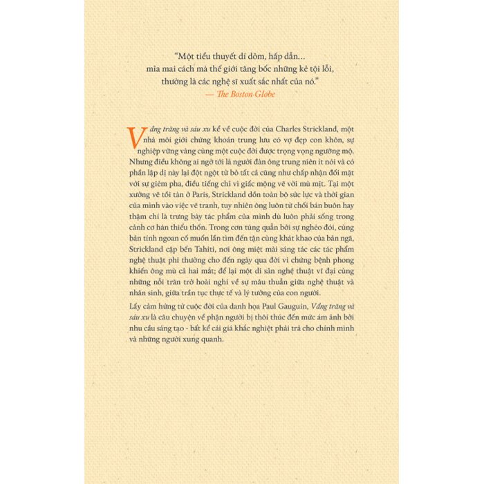 Vầng Trăng Và Sáu Xu "Vầng trăng và sáu xu” kể về cuộc đời của Charles Strickland, một nhà môi giới chứng khoán trung lưu có vợ đẹp con khôn, sự nghiệp vững vàng cùng một cuộc đời được trọng vọng ngưỡng mộ. Nhưng điều không ai ngờ tới là người đàn ông trung niên ít nói và có phần lập dị này lại đột ngột từ bỏ tất cả cũng như chấp nhận đối mặt với sự gièm pha, điều tiếng chỉ vì giấc mộng vẽ vời mù mịt. Tại một xưởng vẽ tồi tàn ở Paris, Strickland dồn toàn bộ sức lực và thời gian của mình vào việc vẽ tranh, tuy nhiên ông luôn từ chối bán buôn hay thậm chí là trưng bày tác phẩm của mình dù luôn phải sống trong cảnh cơ hàn thiếu thốn.