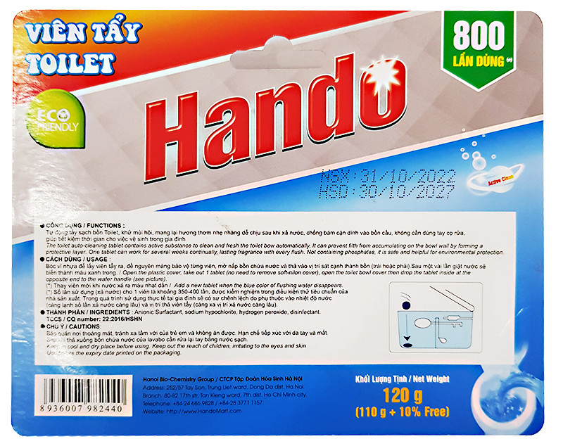 Thông tin sản phẩm Tên sản phẩm : Viên tẩy toilet sạch thơm thơm sạch Hando 400 lần xả nước Công dụng : Tự động tẩy sạch bồn toilet, khử mùi hôi, lưu lại mùi