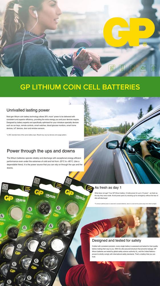 Pin GP Lithium Coin CR2025 có mật độ năng lượng cao và có thể cung cấp thêm 30% năng lượng* cho các thiết bị nhỏ như chìa khóa xe, điều khiển từ xa, đồng hồ thông minh, máy đo đường huyết, thiết bị nhà thông minh, thiết bị IoT, cảm biến cửa và cửa sổ .