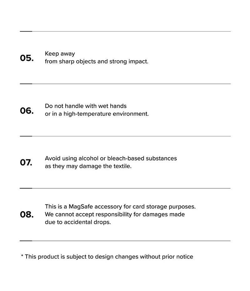 - Nên tháo sản phẩm này trước khi sử dụng sạc Magnetic, sạc không dây hoặc các phụ kiện Magnetic khác.