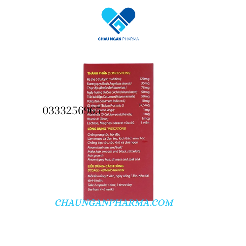 Mua tại TiktokThành phần Hà thủ ô: 120 mg Đương quy: 35 mg Thục địa: 75 mg Ngấy hương: 50 mg Trắc bá diệp: 50 mg Vừng đen: 10 mg Cỏ nhọ nồi: 37.5 mg Nghệ: 1 mg Vitamin B5: 1 mg Vitamin H 1: mcg Lactose, Magnesi stearat vừa đủ 1 viên. Công dụng Giảm rụng tóc, hói đầu. Làm mướt và đen tóc, kích thích mọc tóc. Chống bạc tóc, khô tóc, chống chẻ ngọn. Một số thông tin khác: Quy cách đóng gói: Hộp 100 viên Bảo quản: Bảo quản nơi khô ráo, thoáng mát, tránh ánh nắng trực tiếp từ mặt trời. Để xa tầm tay trẻ em. Liều dùng: Mỗi ngày uống 3 lần, mỗi lần 2 viên. Mỗi đợt uống trong thời gian từ 4 – 6 tuần mới có tác dụng tốt. Lưu ý: Sản phẩm này không phải là thuốc và không có tác dụng thay thế thuốc chữa bệnh. Đọc kỹ hướng dẫn sử dụng trước khi dùng.