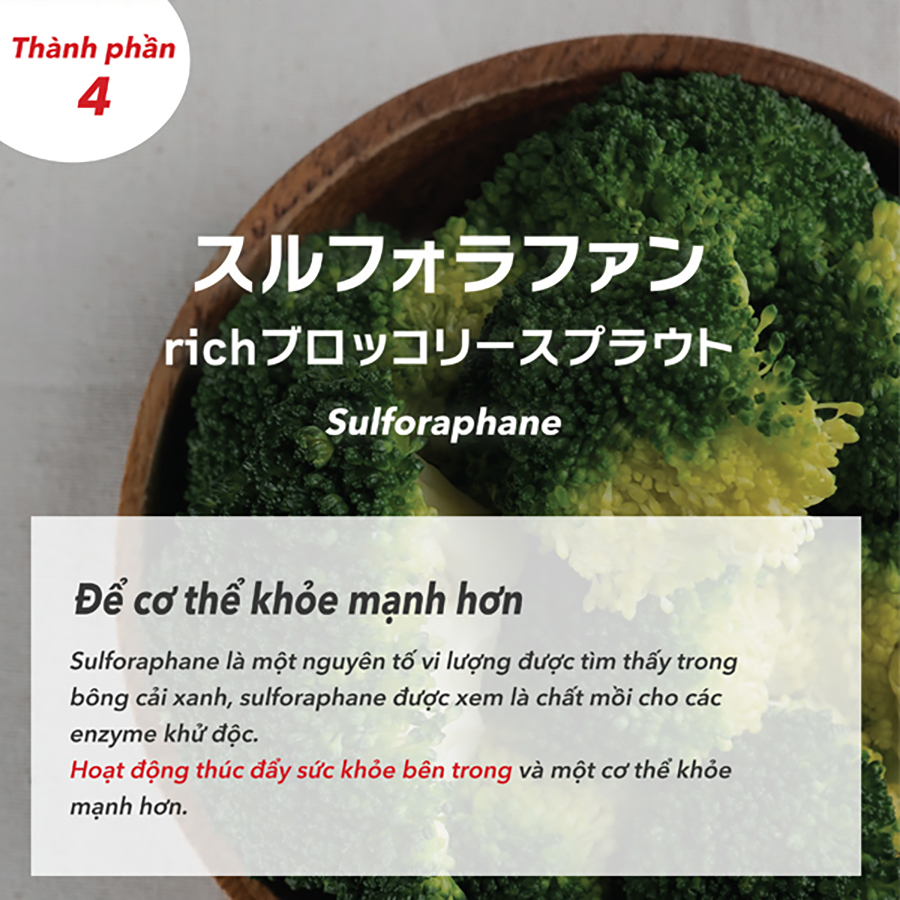 Dầu hoa rum, Gan lợn thủy phân, Ornithine, Men cái, Chiết xuất củ nghệ, Bột nghệ vàng, Chiết xuất hến sông, Bột mầm cây súp lơ xanh, gelatin, glycerin, sáp ong, este của glycerin và axit béo, lecithin.
