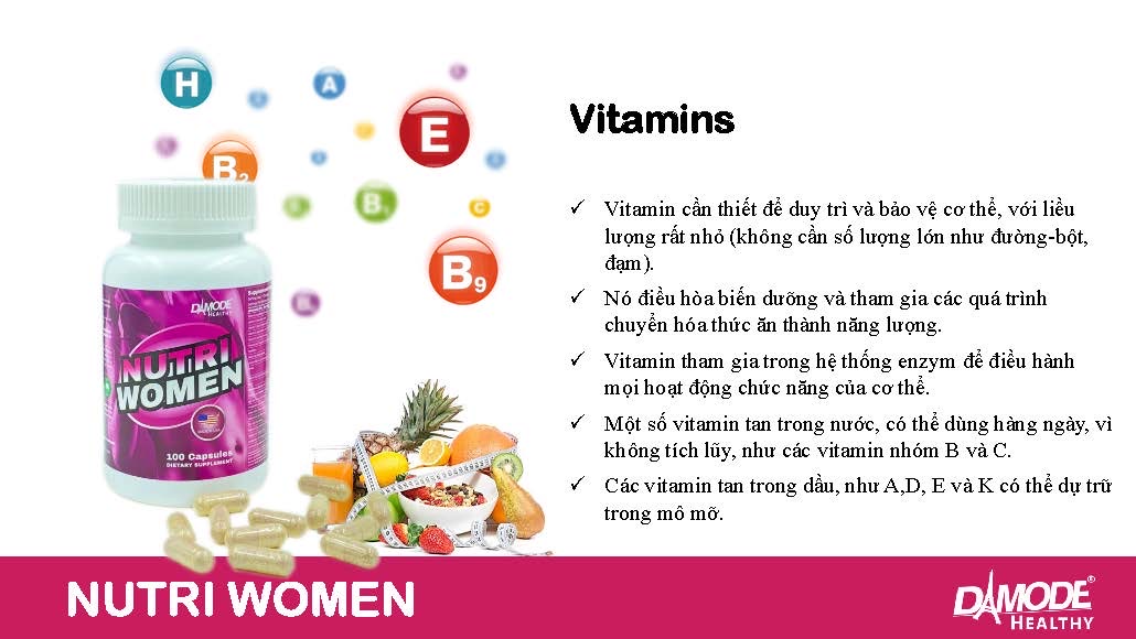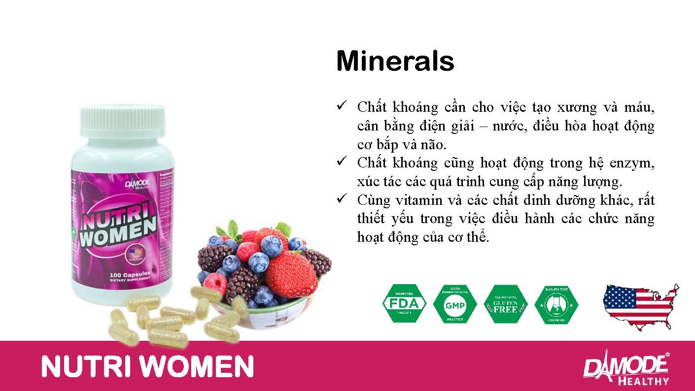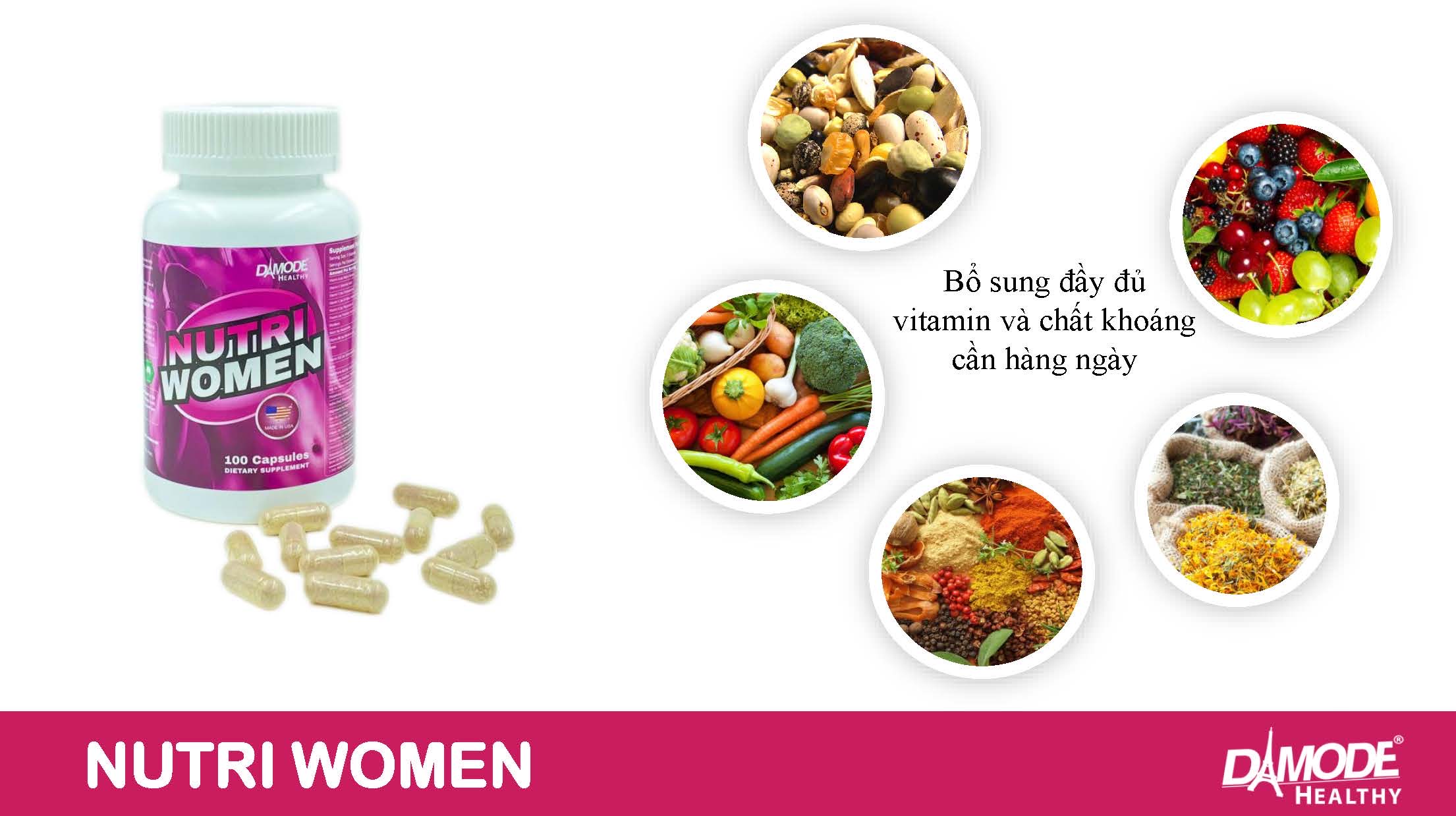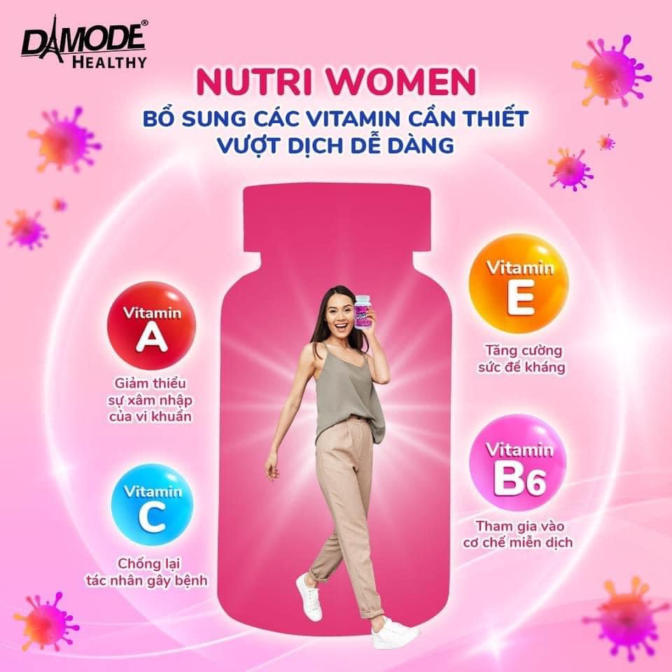 Một sản phẩm Nutri Women từ Damode Healthcare sẽ bổ sung cho bạn đầy đủ vitamin và khoáng chất thiết yếu gồm các hoạt chất sau: