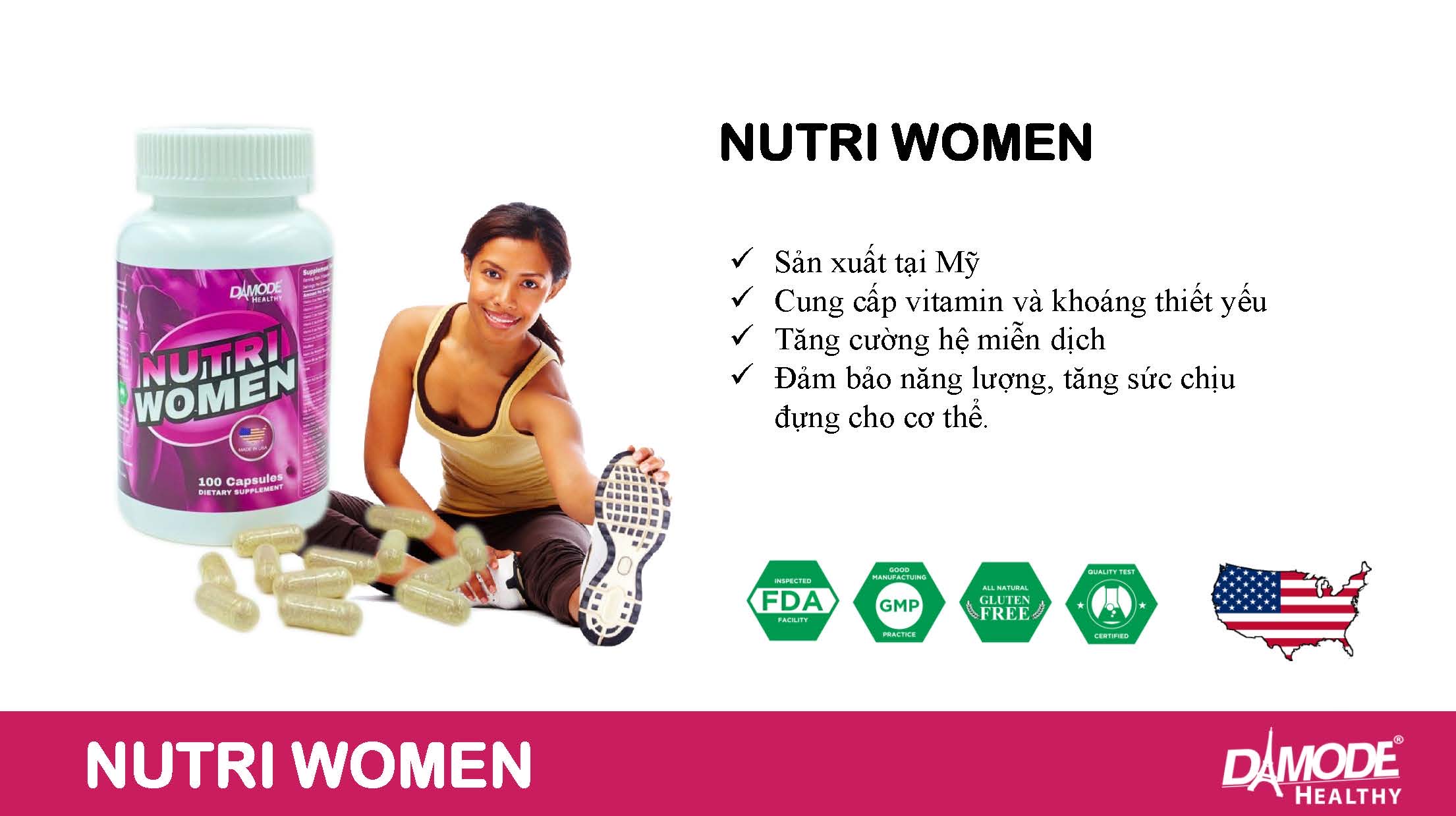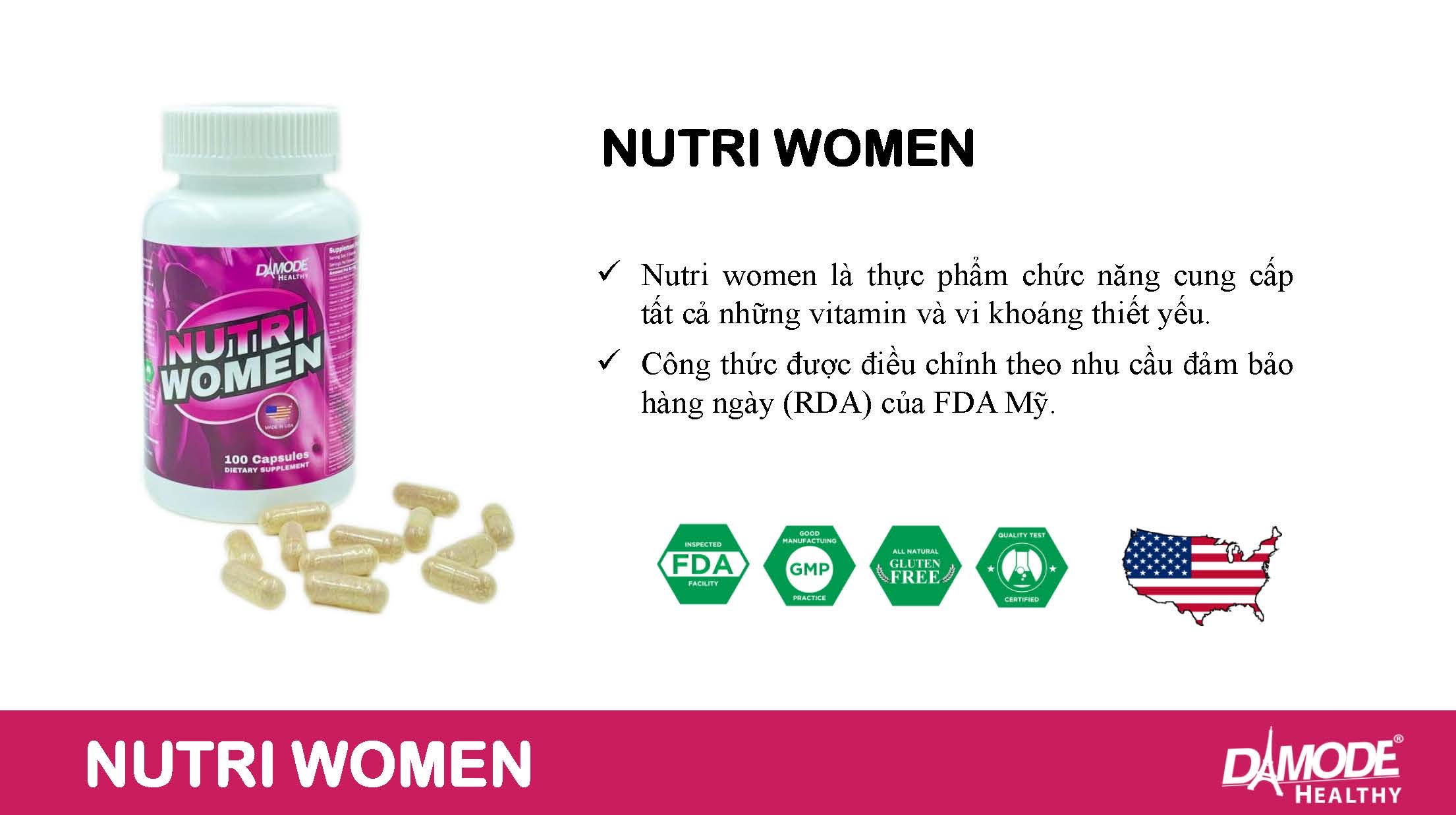 Khi sử dụng các sản phẩm của thương hiệu Damode Healthcare như Nutri Women quý khách hoàn toàn có thể yên tâm và chất lượng và hiệu quả, bởi vì sản phẩm đã được kiểm định lâm sàn, cấp phép tiêu chuẩn an toàn ở người của Bộ Y Tế – Cục vệ sinh an toàn thực phẩm khi lưu hành. Nutri Women được sản xuất theo chế độ dinh dưỡng khuyến cáo RDA của FDA Hoa kỳ và được sự chứng nhận của FDA Hoa Kỳ. Đạt tiêu chuẩn nhập khẩu vào tất cả các quốc gia trên thế giới kể cả thị trường khó tính như Châu Âu.