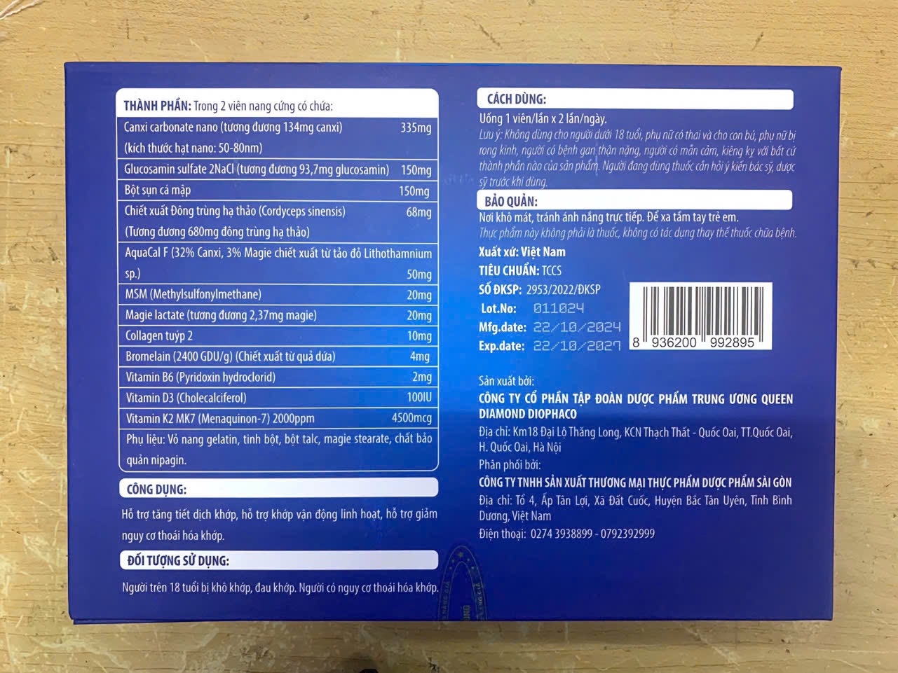 Thông tin chung: Thành phần: - Glucosamin sulfat 2KCl: 750mg - MSM: 120mg - Chondroitin sulfat natri 90%: 50mg - Collagen type 2: 30mg - Bột Sụn vi cá mập: 25mg - Bromelain 2400 GDU/g: