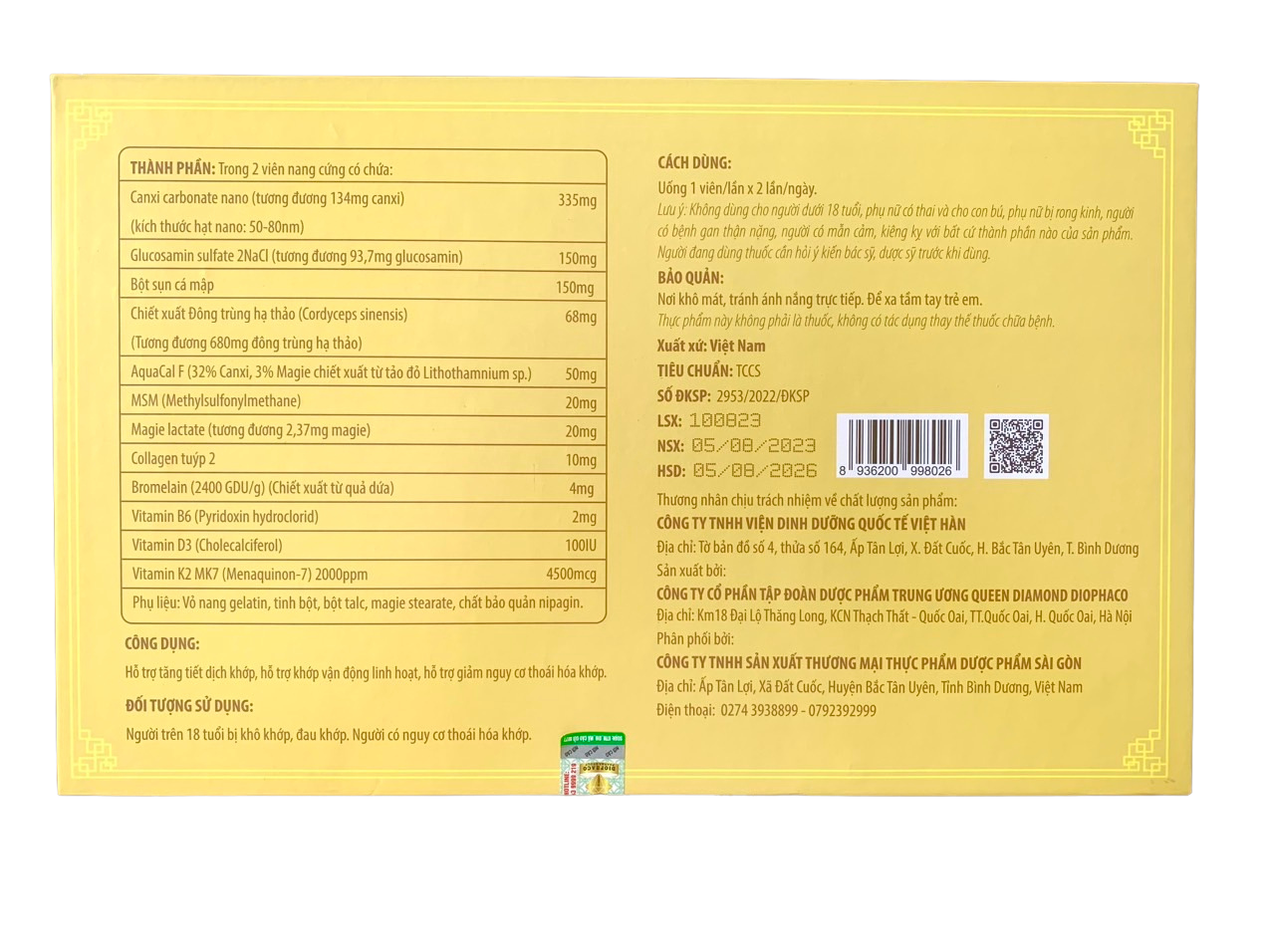 - CÔNG DỤNG Sản phẩm được chiết xuất từ thành phần thảo dược Bổ sung glucosamin hỗ trợ tăng nuôi dưỡng sụn khớp, Hỗ trợ làm trơn các ổ khớp, Hỗ trợ giảm nguy cơ khô khớp, cứng khớp, Hỗ trợ khớp vận động linh hoạt, Hỗ trợ giảm triệu chứng của thoái hóa khớp, viêm khớp. Hỗ trợ giam đau khớp, khô khớp do viêm khớp, thoái hóa khớp