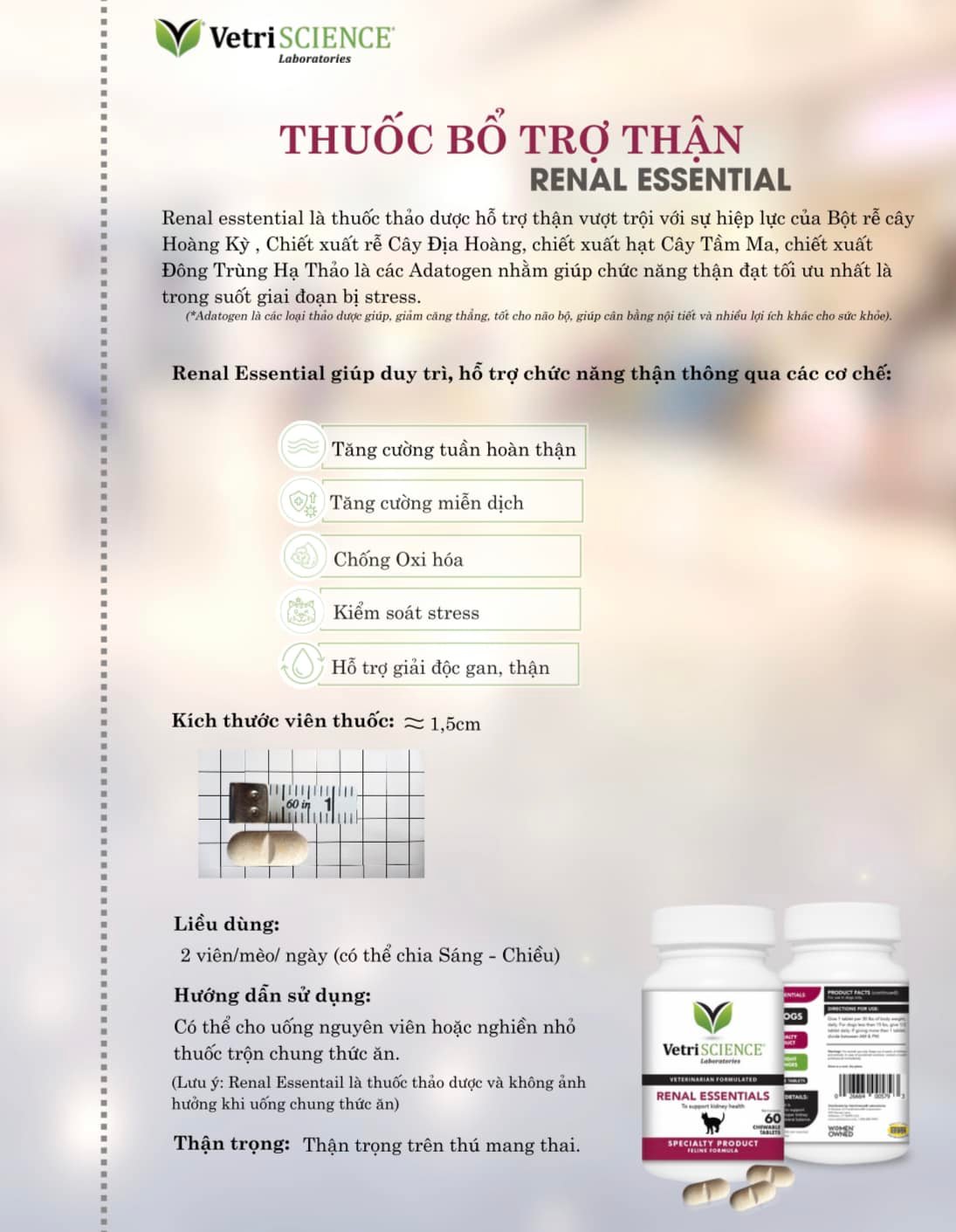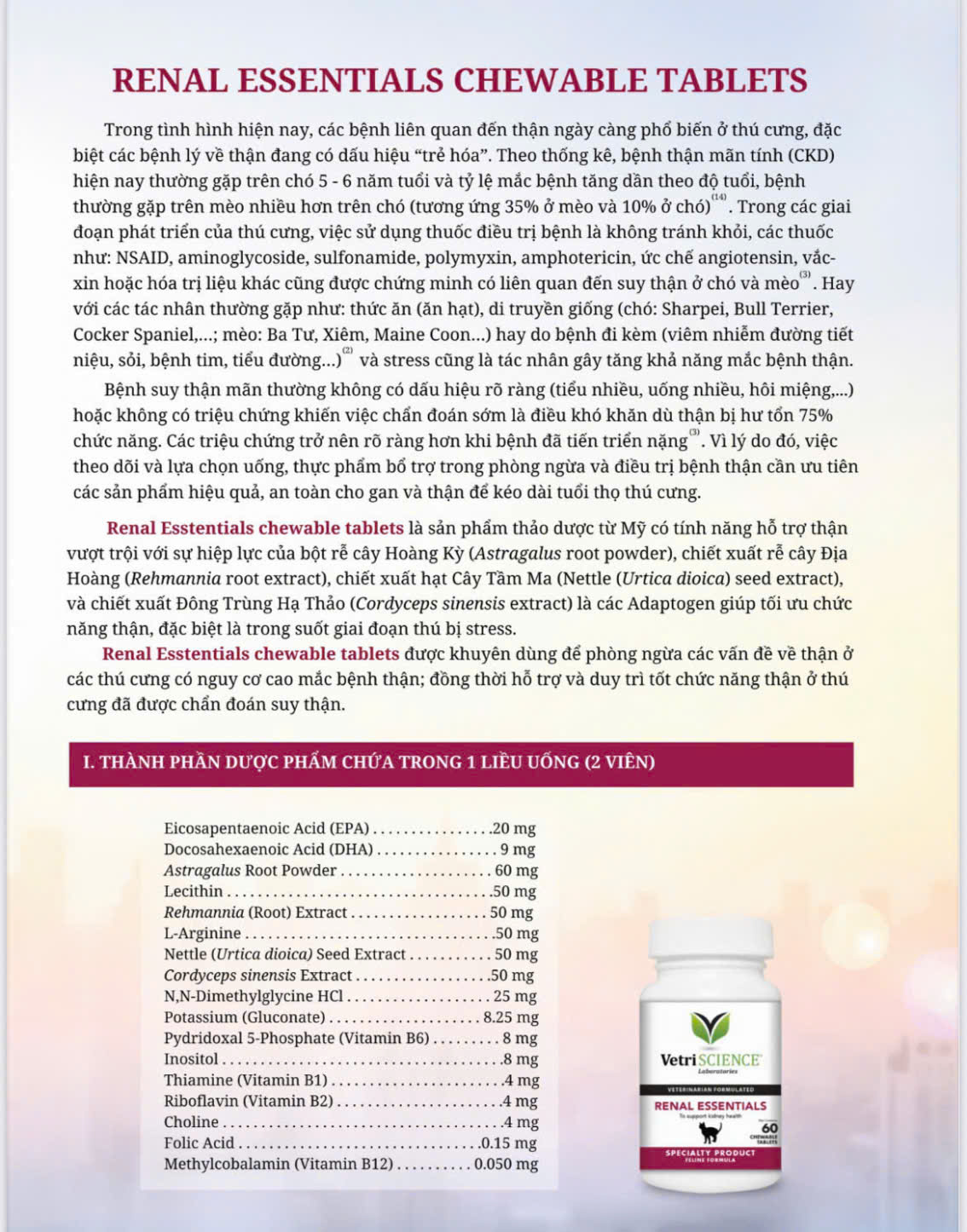 Sản phẩm được dùng trong các trường hợp: Tăng cường chức năng thận. Hỗ trợ cải thiện tuần hoàn máu đến thận. Duy trì chức năng tế bào. Chó và mèo