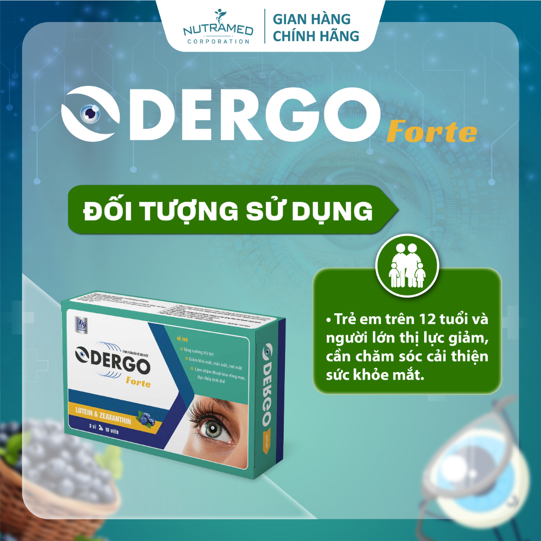 ODERGO FORTE - Hỗ trợ tăng cường thị lực, cải thiện và làm chậm tình trạng thoái hóa võng mạc, đục thủy tinh thể    THÀNH PHẦN  ️ Chiết xuất Việt quất (Vaccinium myrtillus extract), Lutein, Kẽm (kẽm sulfate monohydrate), Zeaxanthin, Đồng (đồng sulfate), Vitamin A (Retinyl palmitat), Vitamin D3 (Cholecalciferol), Vitamin E (DL-alpha-tocopherol)    CÔNG DỤNG    ️ Hỗ trợ tăng cường thị lực, hỗ trợ giảm các triệu chứng khô mắt, mỏi mắt, mờ mắt. ️ Hỗ trợ cải thiện, làm chậm tình trạng thoái hóa võng mạc, đục thủy tinh thể.    ĐỐI TƯỢNG SỬ DỤNG  ️ Trẻ em trên 12 tuổi và người lớn thị lực giảm, cần chăm sóc cải thiện sức khỏe mắt.    HƯỚNG DẪN SỬ DỤNG  ️  Trẻ em trên 12 tuổi và người lớn: Uống 1 viên/lần/ngày.  ️ Uống sau ăn 30 phút.    KHÔNG SỬ DỤNG TRONG TRƯỜNG HỢP  ️  Người có mẫn cảm, kiêng kỵ với bất kỳ thành phần nào của sản phẩm   LƯU Ý  ️  Thực phẩm này không phải là thuốc, không có tác dụng thay thế thuốc chữa bệnh.  ️  Phụ nữ có thai, người đang dùng thuốc hỏi ý kiến chuyên gia y tế trước khi sử dụng    BẢO QUẢN   ️  Nơi khô ráo, nhiệt độ dưới 30°C, tránh ánh nắng trực tiếp.  ️  Để xa tầm tay trẻ em.    THÔNG TIN SẢN PHẨM Tên sản phẩm: ODERGO FORTE Quy cách đóng gói: Hộp 3 vỉ x 10 viên. Hạn sử dụng: 36 tháng kể từ ngày sản xuất. Tiêu chuẩn: TCCS   _ NUTRAMED - KHƠI NGUỒN KHOA HỌC TỚI CUỘC SỐNG   Nhà máy đạt chuẩn WHO – GMP. Nguyên liệu được kiểm tra chất lượng khắt khe bởi nhà máy đạt chuẩn GMP.