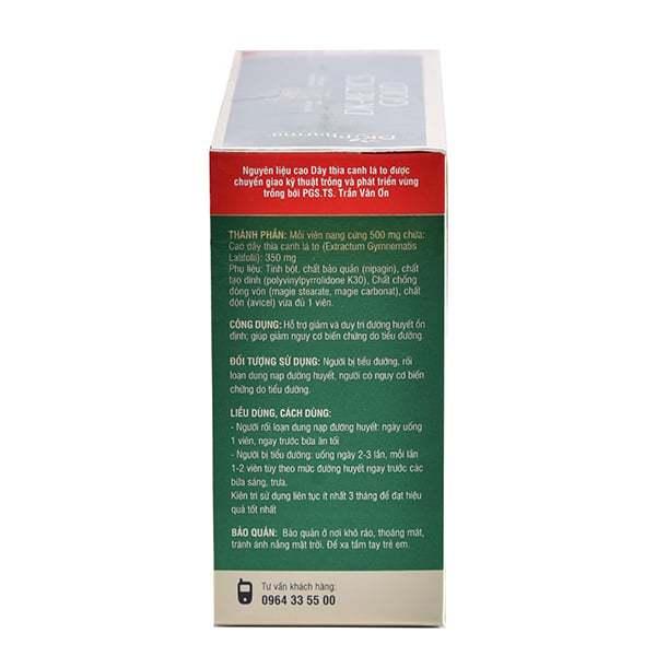 Thành phần Mỗi viên nang có chứa: Cao Dây thìa canh lá to (Extractum Gymnematis latifolii): 350mg Phụ liệu vừa đủ 1 viên 2, Công dụng - Hỗ trợ giảm đường huyết - Hỗ trợ