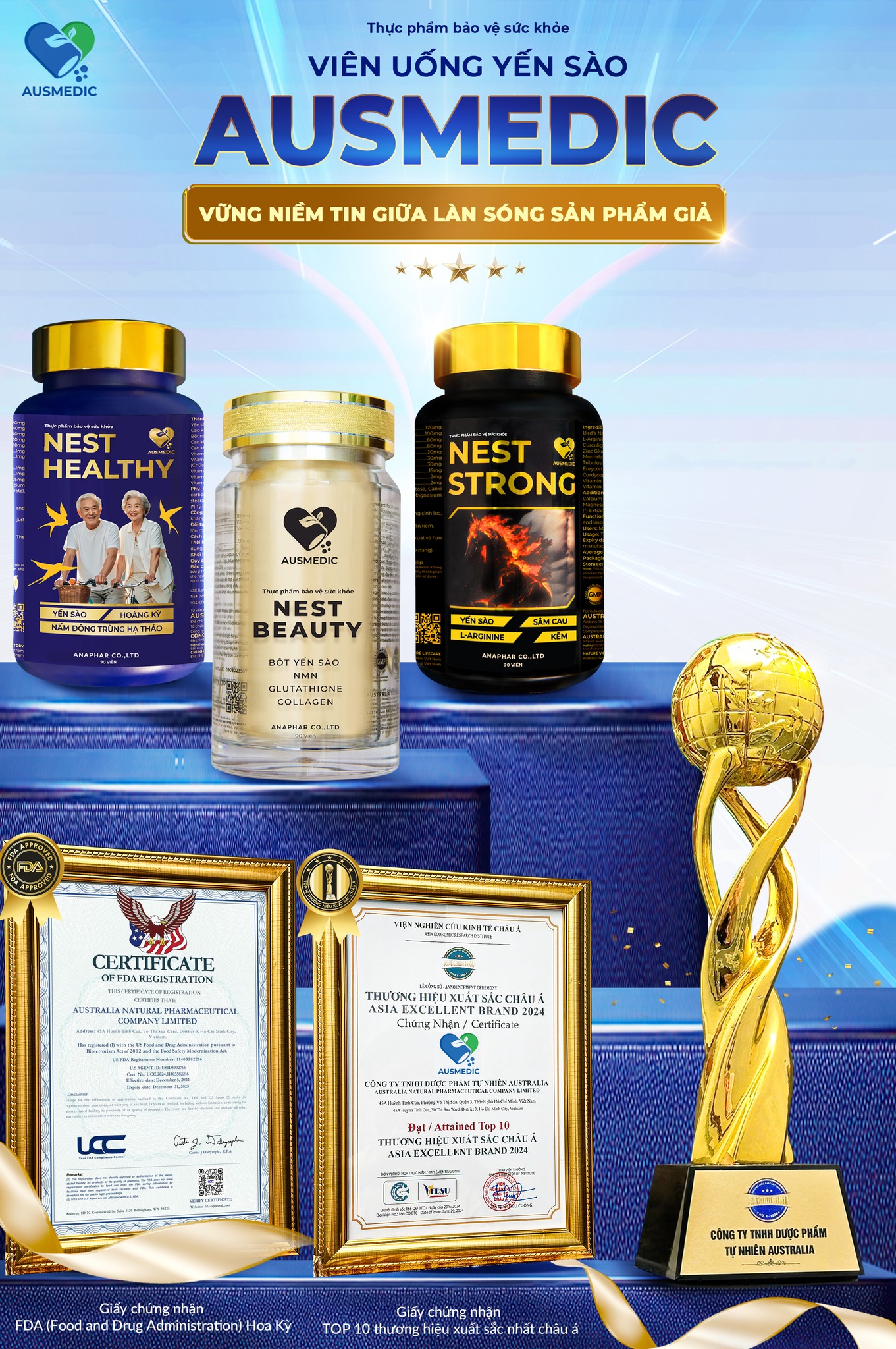 Nest Healthy từ thương hiệu Ausmedic là viên uống yến sào tiên phong tại Việt Nam với công thức độc quyền kết hợp 100% YẾN SÀO NGUYÊN CHẤT từ Cần Giờ cùng bộ tứ dưỡng chất (Đông Trung Hạ Thảo, Hoàng Kỳ, Kim Ngân Hoa và Tổ hợp Vitamin B) theo nồng độ chuẩn y khoa, giúp hỗ trợ tăng đề kháng, nâng cao hệ miễn dịch, ngủ ngon và lưu thông khí huyết so với các sản phẩm thông thường, dễ sử dụng hơn yến chưng truyền thống, đã được kiểm nghiệm an toàn đạt chuẩn FDA (Mỹ) và đạt kiểm nghiệm khắt khe của Bộ Y Tế Việt Nam (7121/2024)