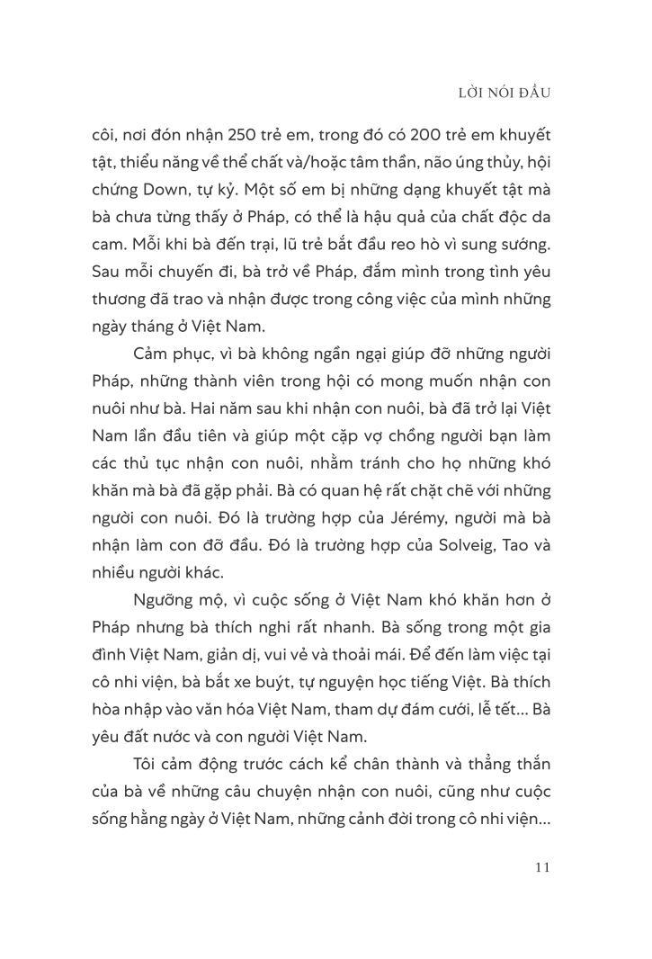 Tôi mong muốn và có nhu cầu chia sẻ những kỷ niệm, những cuộc gặp gỡ và kinh nghiệm sống của mình với trẻ em khuyết tật, với nhân viên trại trẻ mồ côi, cũng như với gia đình này, nơi mà tất cả các thành viên giờ đây chào đón tôi như người thân của họ. Tôi hy vọng, theo cách riêng của họ cùng với sự hào phóng và giản dị, bây giờ đến lượt tôi, tôi mời các bạn bước vào Việt Nam của tôi.