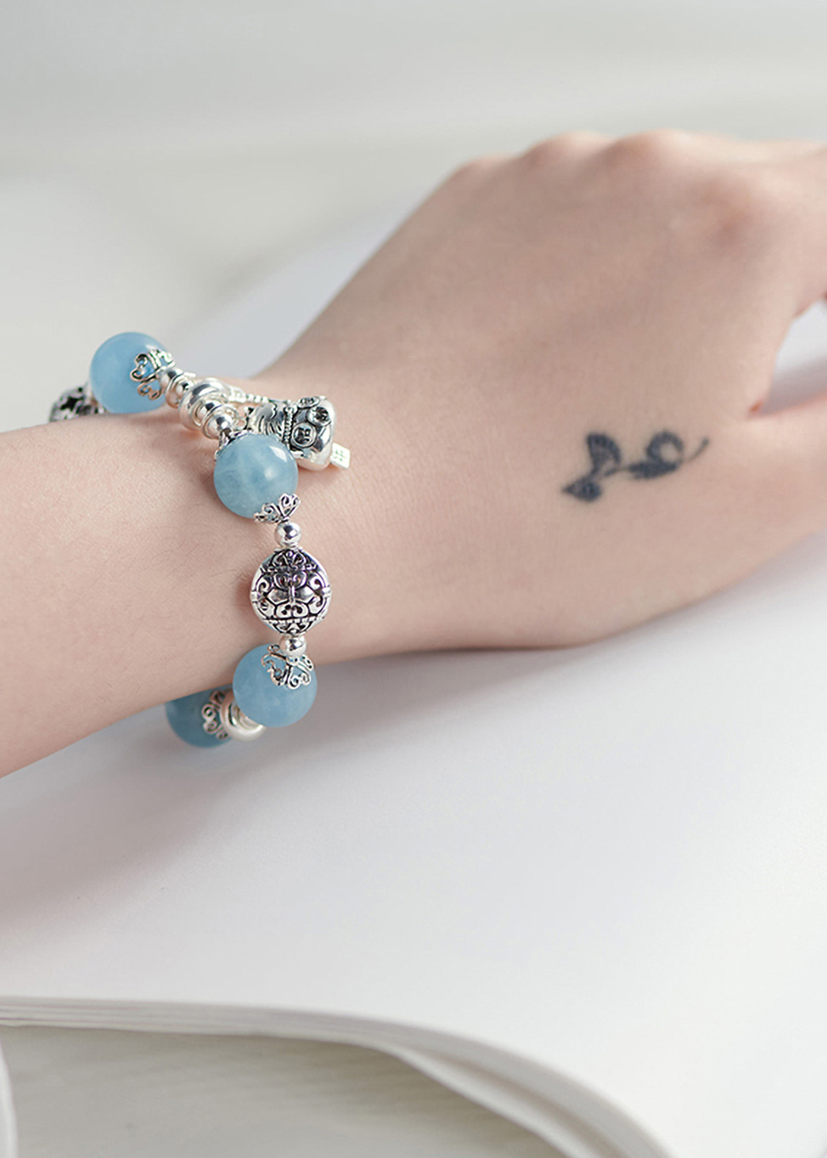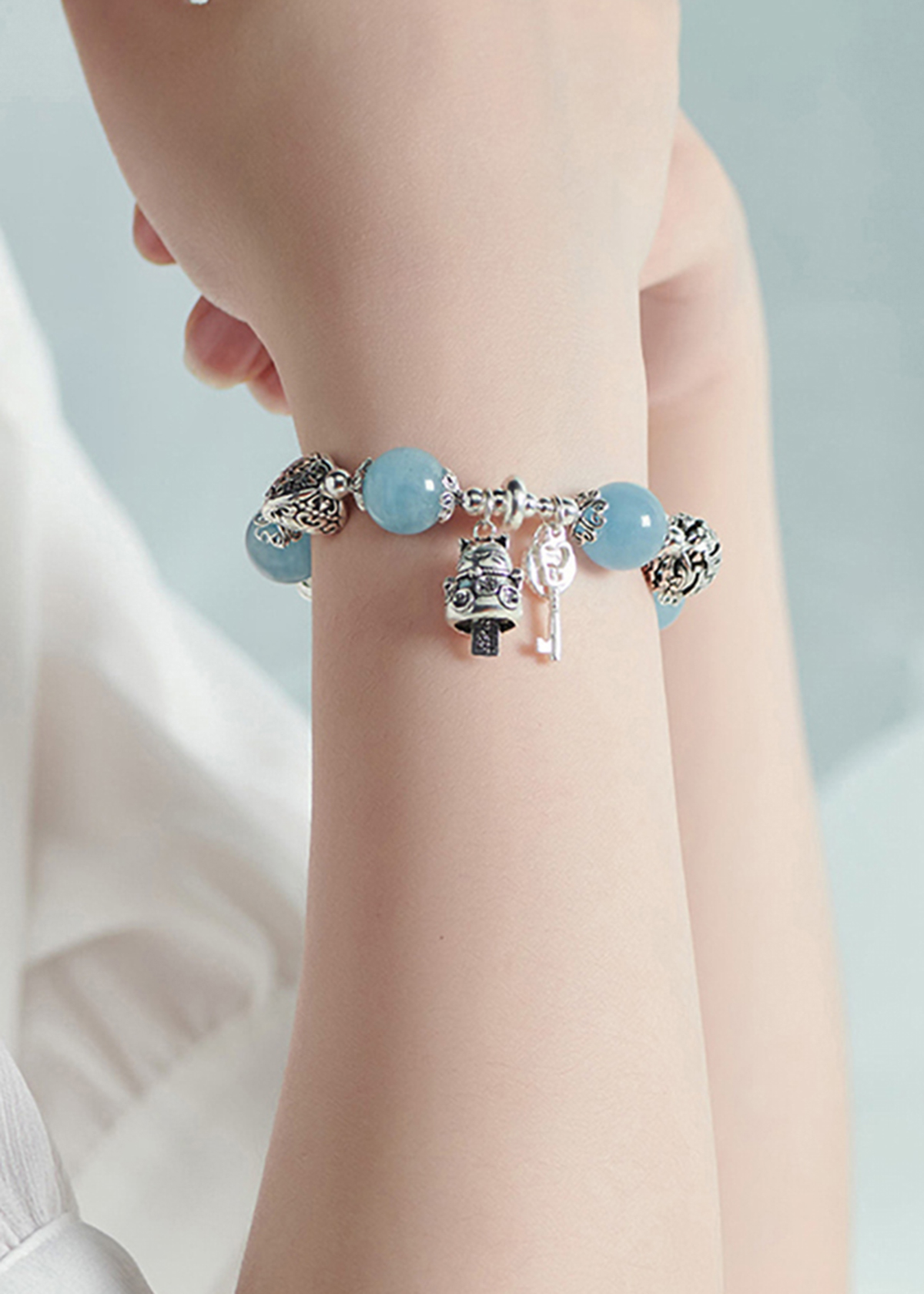 VÒNG TAY ĐÁ AQUAMARINE PHỐI CHARM MÈO BẠC: