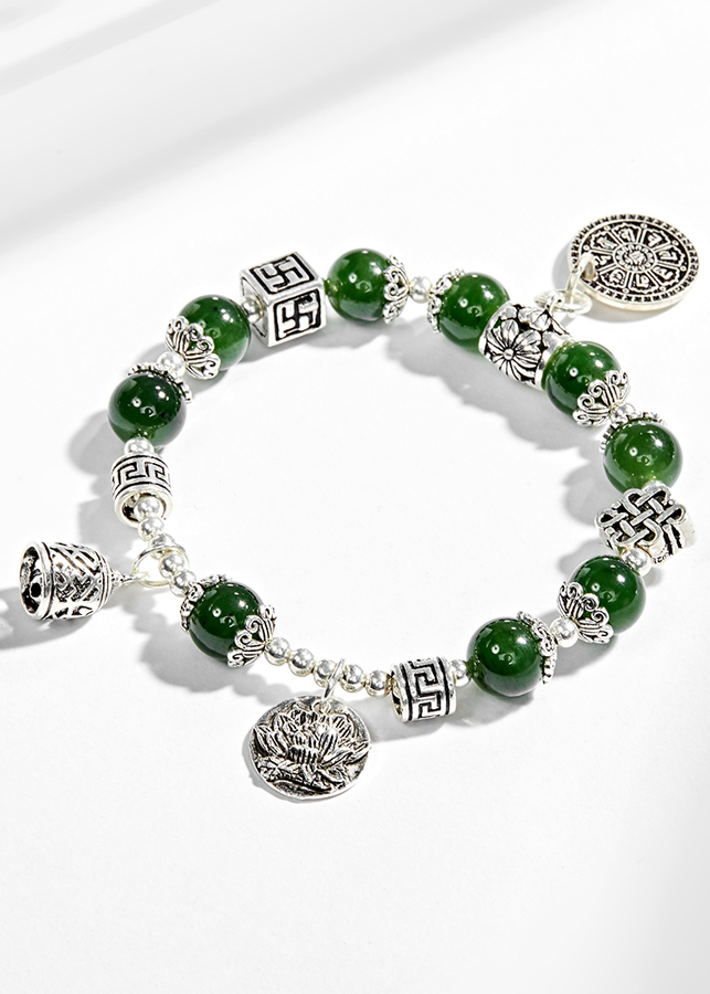 Vòng tay ngọc bích phối charm hoa sen (10mm) có tác dụng mang đến vận may, giúp người đeo tránh được những rủi ro, các thế lực tà ma và sự nguy hiểm.