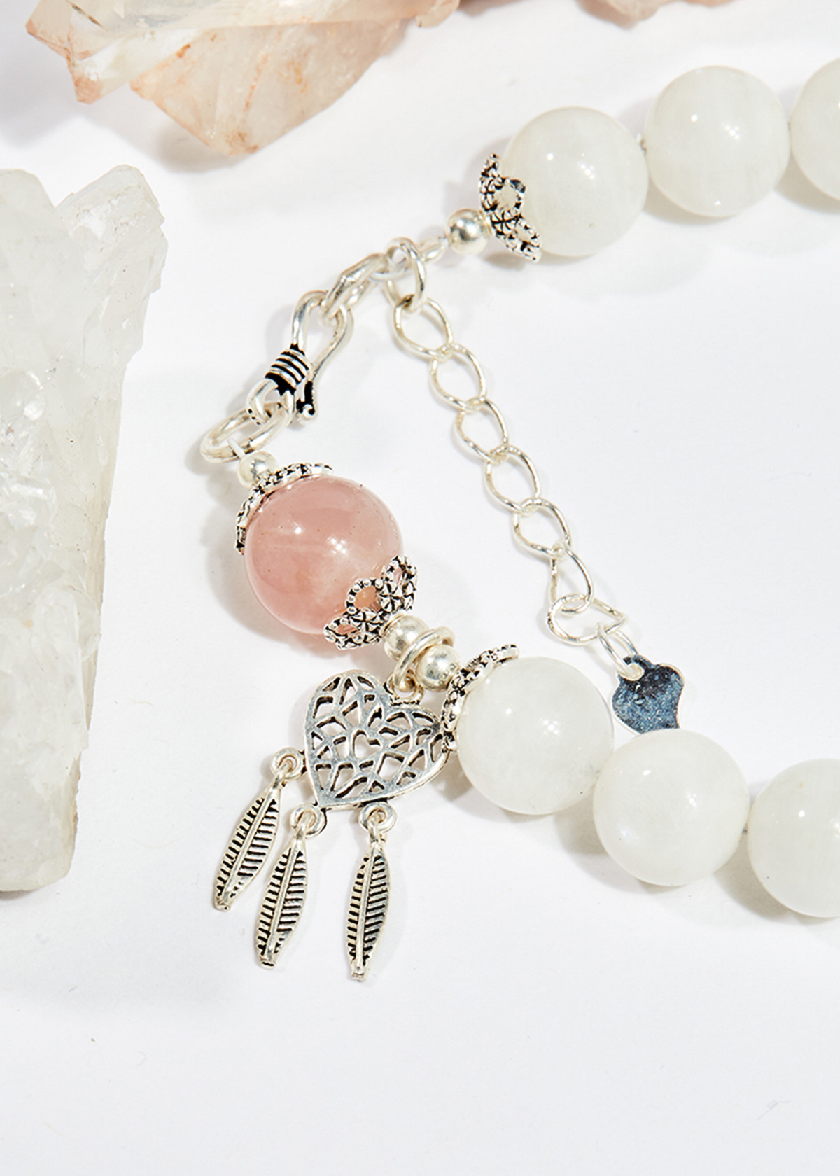 VÒNG TAY ĐÁ XÀ CỪ TRẮNG (MOONSTONE) CHARM DREAMCATCHER: Hình tròn của Dreamcatcher biểu tượng cho vòng tròn cuộc sống,như trái đất sinh mệnh, không có điểm khởi đầu cũng không có điểm kết thúc.