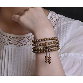: Phật giáo nhìn vào vũ trụ nhân sinh, không phải là duy vật, không phải duy tâm, cũng không phải là duy thần. Mà Phật giáo nhìn vào sự hình thành của con người ở ba trạng thái kết hợp nhau là tâm, sinh và vật lý. Hay nói bằng danh từ Phật học là sự duyên hợp của ngũ uẩn, tứ đại; hoặc căn, trần và thức. Căn là nói về sinh lý, trần là vật lý, và thức là tâm lý. Căn, trần và thức tụ hội nhau để tồn tại. Nếu lìa một chỉ còn hai thì thế giới sẽ không tồn tại. Vậy căn, trần, thức là gì? Căn là: mắt, tai, mũi, lưỡi, thân và ý. Trần là: sắc, thanh, hương, vị, xúc và pháp. Thức là: nhãn thức, nhĩ thức, tỷ thức, thiệt thức, thân thức và ý thức. Từ nơi sáu căn tiếp xúc sáu trần sanh ra sáu thức. Thức tạo tác vọng động, tạo nghiệp hoặc thiện hoặc ác để trôi lăn trong sáu nẻo luân hồi. Ví dụ như mắt nhìn thấy sắc đẹp của một người liền khởi tâm say đắm, từ nơi đắm mê sắc đẹp mà tạo nên hành nghiệp. Cho đến tai nghe âm thanh, mũi ngửi mùi thơm, thân chạm xúc những chỗ trơn láng mềm mại, ý suy nghĩ ghét, thương, hận, thù… Lục căn là công cụ sai khiến của lục thức để tạo tác hành nghiệp thiện hoặc ác. Từ nơi hành nghiệp tích tụ chứa nhóm mang đi trong sáu nẻo luân hồi, từ quá khứ đến hiện tại, và, sẽ tiếp diễn trong tương lai; để chịu khổ trong vòng luân hồi. Quá khứ do sáu căn không thanh tịnh, chạy theo trần cảnh khởi lên đắm trước tạo nghiệp: tham, sân, si, mạn, nghi, ác kiến. Và trong đời vị lai ta lại cũng theo con đường cũ tạo nghiệp sanh tử tham, sân,… này mà đi. Từ nơi mắt thấy sắc tạo nên sáu món căn bản phiền não: tham, sân, si, mạn, nghi, ác kiến; cho đến mắt, tai, mũi, lưỡi, thân và ý, mỗi căn đều tạo nên sáu phiền não căn bản giống nhau: tham, sân, si, mạn, nghi, ác kiến. Mỗi căn chúng ta có sáu thứ căn bản phiền não, và; như vậy, sáu giác quan đã tạo nên 36 thứ phiền não trong đời sống thường ngày. Do đó, cuộc đời của chúng ta liên tục nối tiếp trong ba đời từ quá khứ đến hiện tại và tương lai. Như vậy, trong ba đời ta đã tạo thành 108 thứ phiền não để làm hành trang trong đoạn đường sanh tử không cùng tận. Cho nên, bây giờ chúng ta lần tràng hạt 108 lần trong khi niệm Phật, là quyết tâm đoạn trừ 108 món phiền não mà mình đã tạo trong ba đời. Đoạn trừ 108 món phiền não cũng có nghĩa là làm cho sáu căn thanh tịnh. Chuỗi tràng 108 hạt Sáu căn từ trước đến nay chạy theo sáu trần, khởi lên sáu món phiền não căn bản: tham, sân, si,…ây giờ ta lần tràng hạt niệm Phật, là ngăn cản không cho sáu căn vọng động chạy theo cảnh trần, và, giúp cho sáu căn quay về với tự tánh. Sáu căn cảm nhận sáu trần sanh ra sáu thức, thức vọng động tạo nghiệp luân lưu trong vòng sống chết. Lần tràng niệm Phật là không cho căn nhiễm với trần; căn không nhiễm trần tức căn thanh tịnh, căn đã tịnh thì nghiệp không còn, nghiệp đã dứt sanh tử đoạn diệt. Ấy gọi là giải thoát, hoặc vãng sanh về thế giới Cực Lạc của Phật A Di Đà. Theo Phật sử, Vua Ấn Độ Tỳ Lưu Ly thỉnh Đức Phật Thích Ca dạy cho pháp môn diệc trừ phiền não, Phật dạy nhà vua dùng hạt một loại cây gọi là “Vô Hoạn Tử” hay còn gọi là “Bồ Đề Tử” xâu thành chuỗi để niệm danh hiệu Phật thì sẽ tiêu trừ mọi phiền não. Trong Kinh Phật dạy: “Nếu như muốn tiêu trừ các phiền não chướng, nên xâu chuỗi 108, luôn đem theo bên mình, hoặc đi đứng nằm ngồi, lần chuỗi niệm Phật, niệm Pháp, niệm Tăng, lần chuỗi trì niệm danh hiệu Phật càng nhiều càng tốt. Nếu như mãn 20 vạn biến thì có thể đạt đến Thân Tâm Bất Loạn. Chuỗi còn là tín vật cho việc truyền thừa, kỷ vật. Vì vậy chuỗi tràng trong Phật Giáo ngoài công năng là pháp khí tu hành ra còn là bảo vật của Tam Bảo, tín vật của sự truyền Pháp và là pháp vật chứa đựng công đức, cũng như thần lực rất cao vì tích tụ sự tu trì, công đức của các bậc tu hành Vòng tay - chuỗi hạt trầm hương, không chỉ mang lại nhiều may mắn cho người mang mà còn có thể trừ tà, khử các khí độc không tốt ảnh hưởng đến sức khỏe. Và đặc biệt hơn đây là một vật phẩm rất có ý nghĩa trong phong thủy bởi vì trầm hương được biết tới nhiều nhất vì nó hút linh khí của trời và đất để tạo ra hương thơm tự nhiên.Vòng tay trầm hương là vật giúp cảm thấy bình an, nhắc nhở ta luôn từ bi hủy xã, kiềm chế nóng giận, bực tức. Mang lại may mắn, tài lộc cho gia chủ