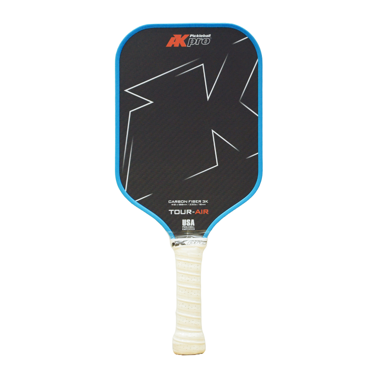 Vợt Pickleball TOUR-AIR Xanh Mã sản phẩm: TOUR-AIR XANH Chất liệu bề mặt: Sợi Carbon 3K Chất liệu lõi: PolyPropylene Trọng lượng: 230 gram KChiều rộng mặt vợt: 188mm Chiều dài tổng thể: 418mm Cán