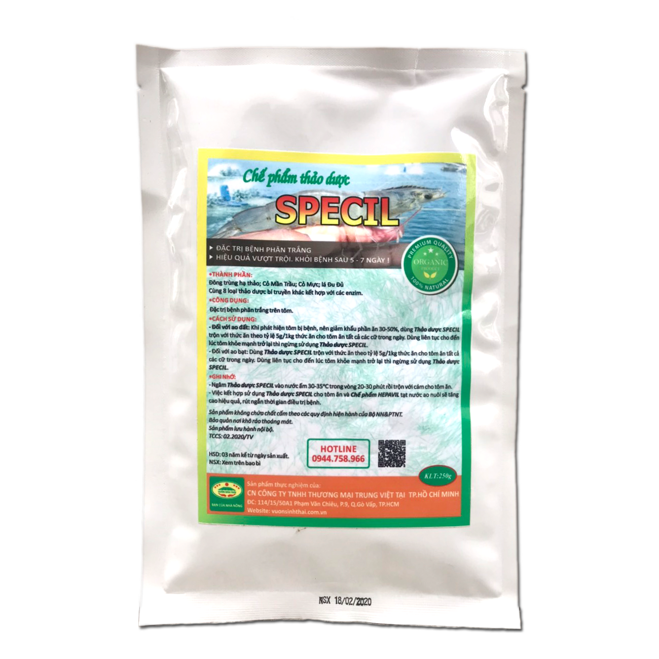 Chế phẩm thảo dược SPECIL ⇒ Đặc trị bệnh Phân Trắng trên Tôm ⇒ Hiệu quả vượt trội – Khỏi dứt điểm sau 5-7 ngày ! “Thảo dược SPECIL là dòng chế phẩm sinh học cao cấp với hiệu lực cực mạnh. Chiết xuất 100% từ đông trùng hạ thảo, thảo dược thiên nhiên quý hiếm. Là giải pháp nuôi tôm sinh học an toàn bền vững mà không cần sử dụng thuốc kháng sinh độc hại !” • THÀNH PHẦN: Đông trùng hạ thảo; Cỏ Mần Trầu; Cỏ Mực; lá Đu Đủ Cùng 8 loại thảo dược bí truyền khác kết hợp với các enzim cao cấp. Khối lượng tịnh: 250g HSD: 3 năm Chế phẩm thảo dược SPECIL – Đặc trị bệnh phân trắng trên tôm • CÔNG DỤNG:  Thảo dược đặc trị bệnh phân trắng trên tôm. Bệnh rỗng ruột, phân lỏng. Rỗng ruột, ruột đứt khúc • CÁCH SỬ DỤNG: Ngâm Chế phẩm Thảo dược SPECIL vào nước ấm 30-35oC trong vòng 20-30 phút rồi trộn vào cám cho tôm ăn. – Đối với ao đất: Khi phát hiện tôm bị bệnh, nên giảm khẩu phần ăn 30-50%, dùng Chế phẩm Thảo dược SPECIL trộn với thức ăn theo tỷ lệ 5g/1kg thức ăn cho tôm ăn tất cả các cữ trong ngày. Dùng liên tục cho đến lúc tôm khỏe mạnh trở lại thì ngừng sử dụng . – Đối với ao bạt: Dùng Thảo dược SPECIL trộn với thức ăn theo tỷ lệ 5g/1kg thức ăn cho tôm ăn tất cả các cữ trong ngày. Dùng liên tục cho đến lúc tôm khỏe mạnh trở lại thì ngừng sử dụng Chế phẩm Thảo dược SPECIL. • GHI NHỚ: – Việc kết hợp sử dụng Thảo dược SPECIL cho tôm ăn và  tạt nước ao nuôi sẽ tăng cao hiệu quả, rút ngắn thời gian điều trị bệnh. – Sau khi tôm dứt bệnh nên sử dụng  trộn với cám cho tôm ăn, giúp tôm mau chóng phục hồi thể trạng, khỏe mạnh, lớn nhanh. Chế phẩm thảo dược SPECIL là giả pháp thay thế cho thuốc kháng sinh đặc trị bệnh phân trắng trên tôm Sản phẩm không chứa chất cấm theo các quy định hiện hành của Bộ NN&PTNT. TCCS: 02.2020/TV | Sản phẩm lưu hành nội bộ. Bảo quản nơi khô ráo thoáng mát. . Thảo được đặc trị bệnh phân trắng trên tôm được sử dụng rất phổ biến tại Cà Mau ĐÃ CÓ NHỮNG AI SỬ DỤNG ? Đã có hàng ngàn khách hàng đang sử dụng các sản phẩm thủy sản của VƯỜN SINH THÁI. Bà con có thể tham khảo các khách hàng đã sử dụng  – Anh Diễn – Khu 7, Hải Hòa, Móng Cái, Quảng Ninh – Anh Bảo – Thôn Long Thạnh, Tam Tiến, Núi thành, Quảng Nam – Anh Bình – Nghĩa Hòa, Tư Nghĩa, Quảng Ngãi – Anh Tới – UBND xã Ngọc Đông, Mỹ Xuyên, Sóc Trăng – Anh Thật – Ấp Bình Huề 2, Đại Hòa Lộc, Bình Đại, Bến Tre – Chị Phi – Thôn Tuần Lễ, Vạn Thọ, Vạn Ninh, Khánh Hòa – Chị Thảo – Thôn Hòa An, Tam Hòa, Núi Thành, Quảng Nam – Anh Điền – Ấp Thạnh Lợi, Hòa Điền, Kiên Lương, Kiên Giang… Và rất nhiều hộ nuôi tôm trên cả nước đã sử dụng rất hiệu quả, đẩy lùi dịch bệnh và kháng sinh gây hại.
