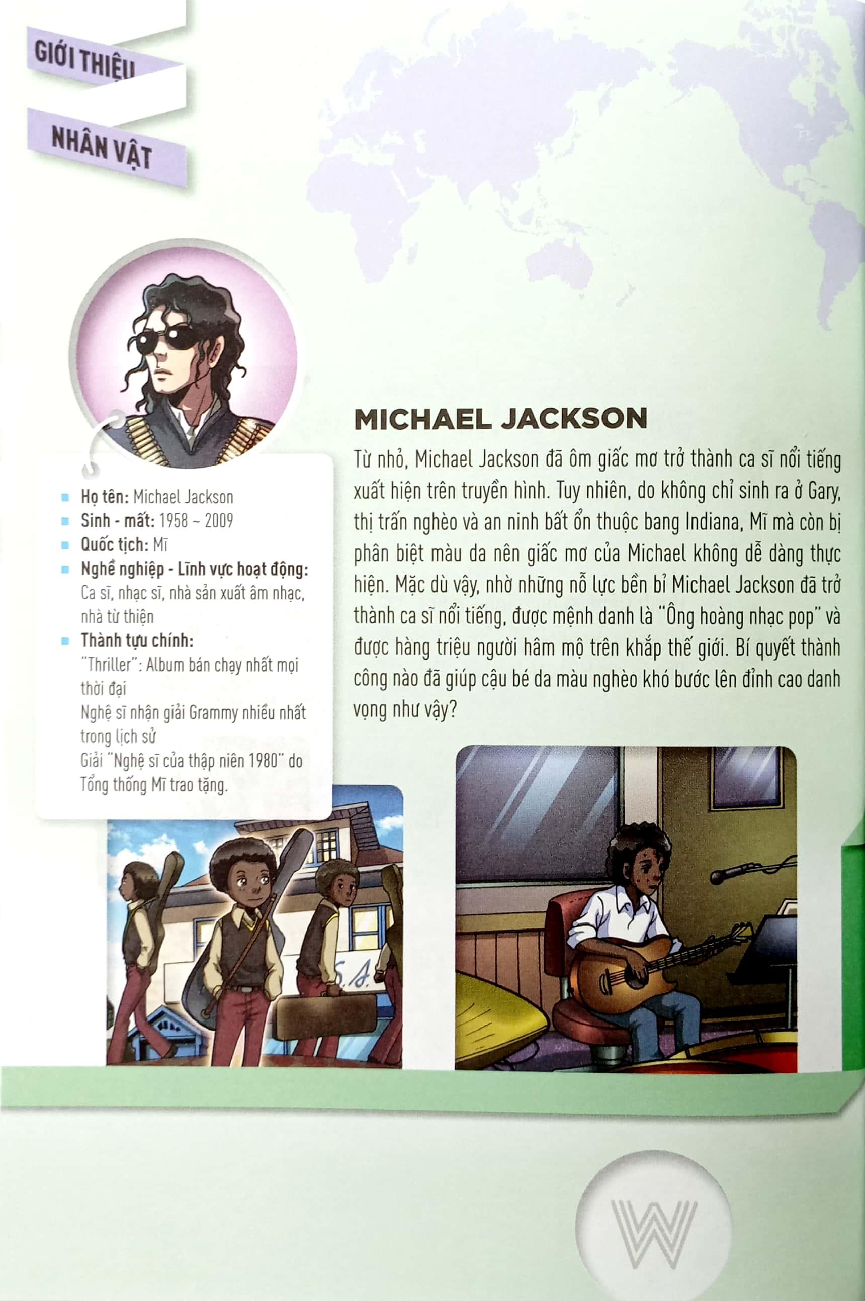 Mua tại TiktokWHO? Chuyện Kể Về Danh Nhân Thế Giới: Michael Jackson (Tái Bản 2023) Michael Jackson – Từ một cậu bé có năng khiếu hát và nhảy thiên phú trở thành “Ông hoàng nhạc pop” được hàng triệu người yêu nhạc khắp thế giới mến mộ! Ngay từ khi còn nhỏ, cậu bé MichaelJackson đã bộc lộ tài năng hát và nhảy thiên phú khiến biết bao người yêu mến. Bằng ý chí và tình yêu âm nhạc, Michael Jackson đã vượt qua sự nghèo khó, nạn phân biệt chủng tộc… để trở thành huyền thoại bất tử trong làng âm nhạc thế giới. Bộ tranh truyện WHO? Chuyện kể về danh nhân thế giới - người bạn thân thiết của thiếu nhi. Những câu chuyện về cuộc đời và sự nghiệp vĩ đại của các danh nhân sẽ đem đến cho các em những ước mơ và hoài bão cao đẹp!