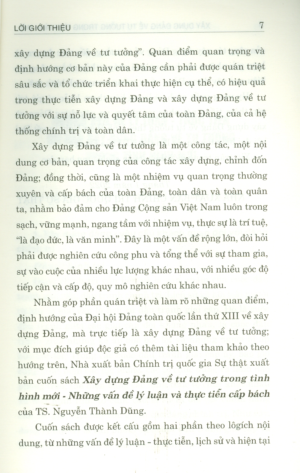 Xây dựng Đảng về tư tưởng là một công tác, một nội dung cơ bản, quan trọng của công tác xây dựng, chỉnh đốn Đảng; đồng thời, cũng là nhiệm vụ quan trọng thường xuyên và cấp bách của toàn Đảng, toàn dân và toàn quân ta, nhằm đảm bảo cho Đảng Cộng sản Việt Nam luôn trong sạch, vững mạnh, ngang tầm với nhiệm vụ, thực sự là trí tuệ, "là đạo đức, là văn minh". "Xây Dựng Đảng Về Tư Tưởng Trong Tình Hình Mới - Những Vấn Đề Lý Luận Và Thực Tiễn Cấp Bách" góp phần quán triệt và làm rõ những quan điểm, định hướng của Đại hội Đảng toàn quốc lần thứ XIII về xây dựng Đảng, mà trực tiếp là xây đựng Đảng về tư tưởng. Nội dung sách gồm hai phần: Những vấn đề lý luận-thực tiễn, lịch sử và hiện tại của công tác xây dựng Đảng về tư tưởng; Đưa ra và luận giải những nội dung và giải pháp cơ bản nhằm nâng cao hiệu quả xây dựng Đảng về tư tưởng trong tình hình mới.