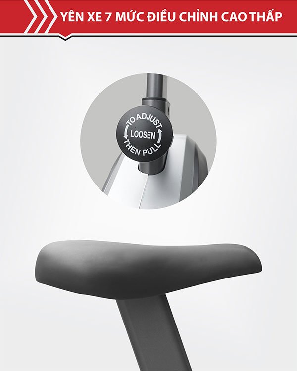 • Yên xe được bọc nệm da cao cấp đem lại cảm giác êm ái cho người luyện tập, điểm đặc biệt yên có thể điều chỉnh độ cao thấp với 7 mức khác nhau phù hợp với chiều cao của đa số mọi người.
