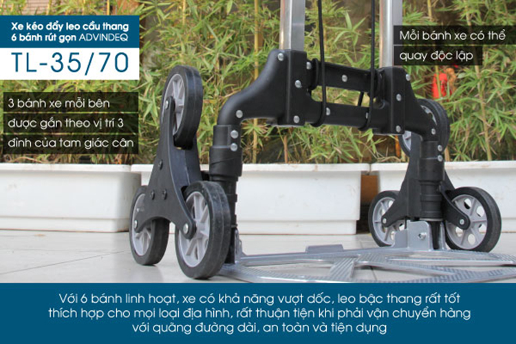 Xe Kéo Đẩy Leo Cầu Thang 6 bánh rút gọn ADVINDEQ TL-35/70 trọng tải leo cầu thang 35 kg, đường bằng 70kg được làm bằng hợp kim nhôm có độ bền cao, trọng lượng xe 3.5kg cực nhẹ so với các sản phẩm xe đẩy hàng sắt thông thường trên thị trường.