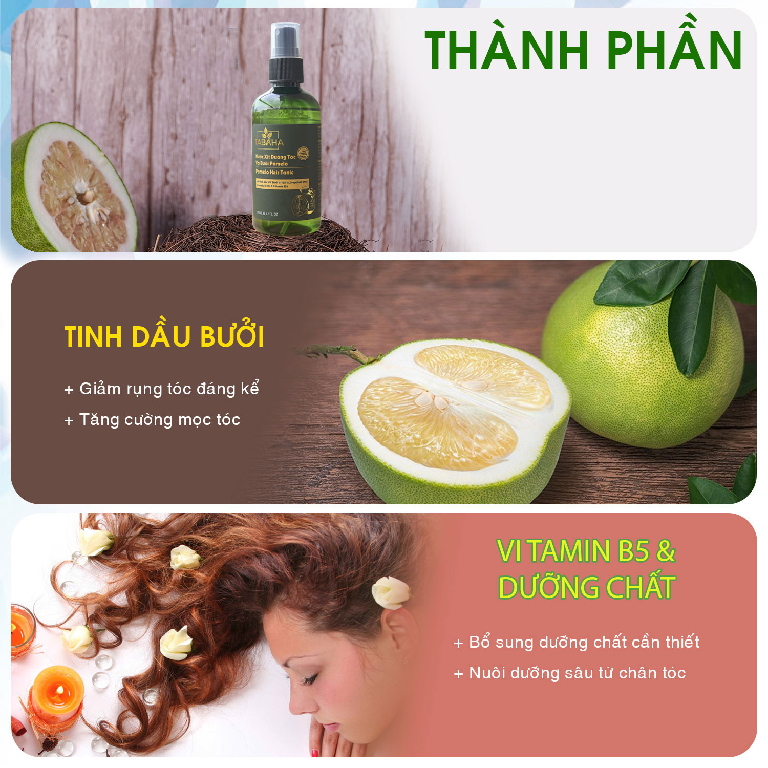 NƯỚC DƯỠNG TÓC TINH DẦU VỎ BƯỞI POMELO TABAHA 120ML Thành phần chính Nước dưỡng tóc tinh dầu bưởi (pomelo hair tonic) Tabaha 120ml: - Tinh dầu vỏ bưởi: Do có tính kháng khuẩn và
