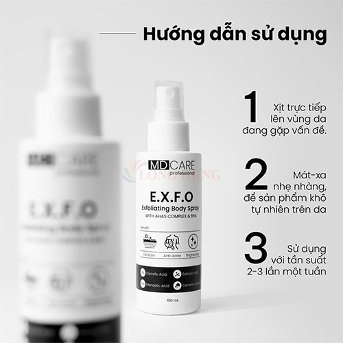 Xịt tẩy tế bào chết toàn thân MD CARE Exfoliating Body Spray là giải pháp làm sạch da hiệu quả. Sản phẩm dạng xịt tiện lợi, giúp loại bỏ tế bào chết và bã nhờn,