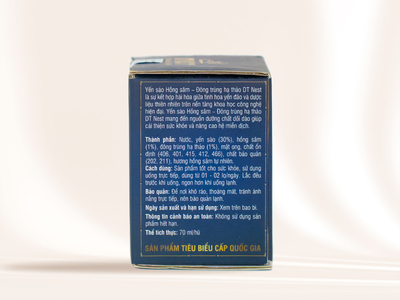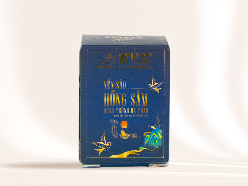 30% yến sào, 1% hồng sâm, 1% đông trùng hạ thảo, mật ong, hương hồng sâm tự nhiên.
